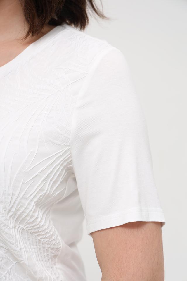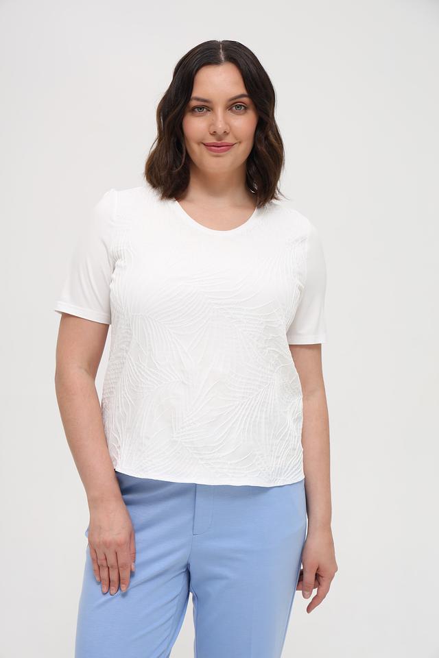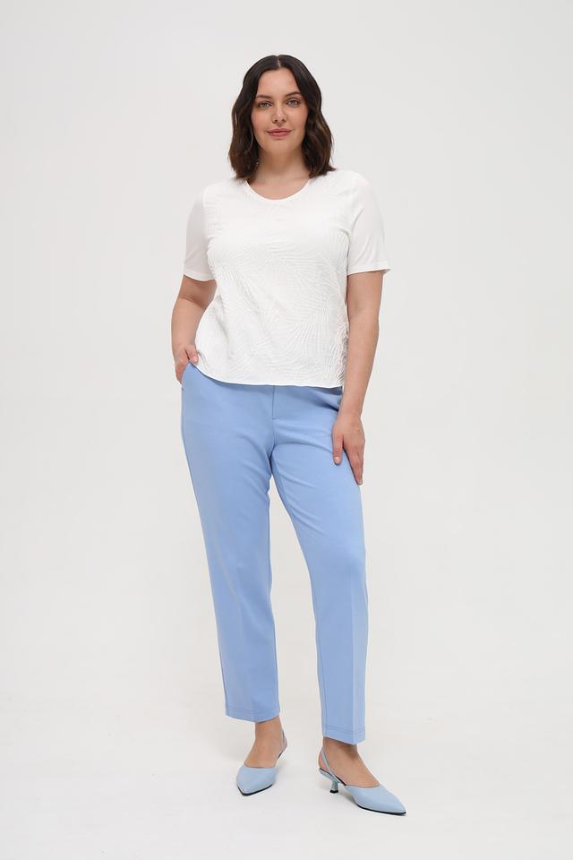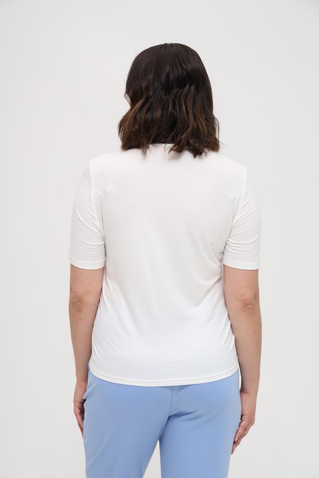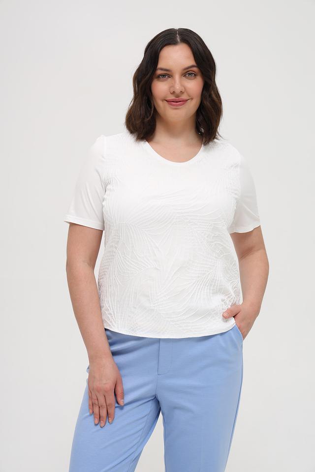 Блуза имеет прямой крой, короткие рукава и округлый вырез горловины. Изготовлена из высококачественной вискозы с добавлением эластана (93% вискоза, 7% эластан), что обеспечивает приятные тактильные ощущения и хорошую посадку по фигуре.