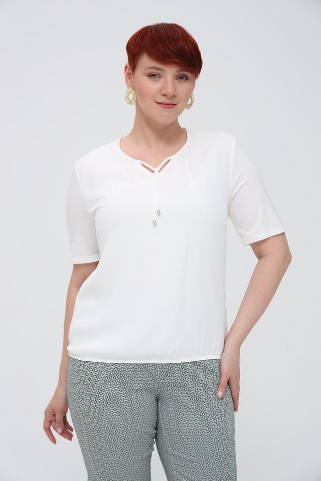 Блуза имеет короткие рукава и V-образный вырез, который украшен тонкими завязками, добавляющими образу игривости и женственности. Простой, но элегантный дизайн позволяет сочетать эту блузу с различными предметами гардероба – от классических брюк до юбок.