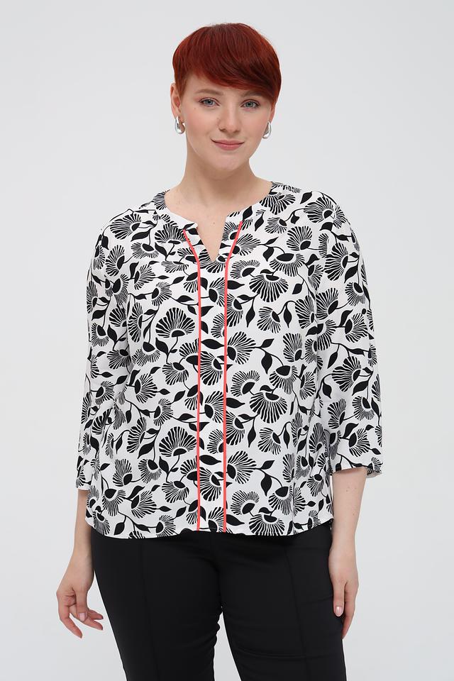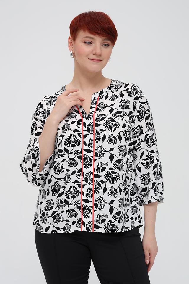 Блуза имеет свободный крой и короткие рукава, что обеспечивает свободу движений. Особенностью модели является яркий цветочный принт в черном цвете на белом фоне, а также контрастная розовая отделка по вырезу горловины и центру полочки.