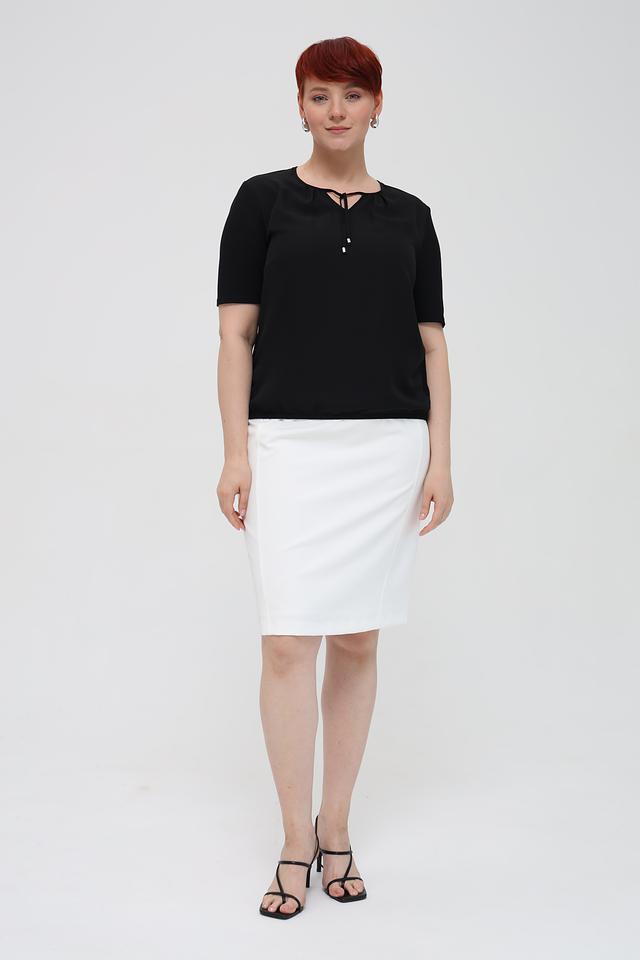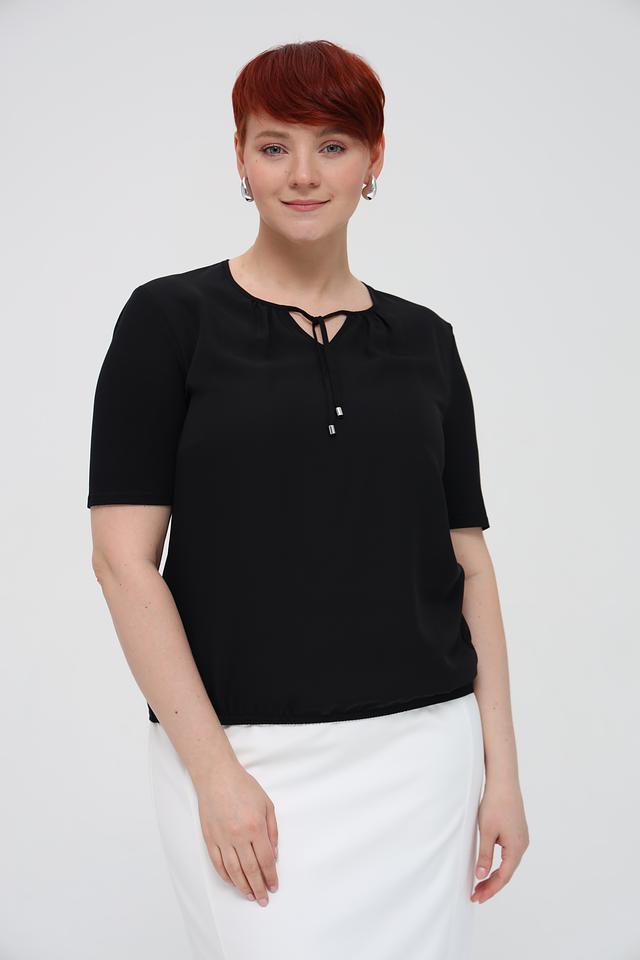 Модель имеет короткие рукава и округлый вырез горловины, украшенный тонкими завязками, которые добавляют образу женственности и изысканности. Блуза выполнена из высококачественной вискозы с добавлением эластана, что обеспечивает приятные тактильные ощущения и комфорт при носке.