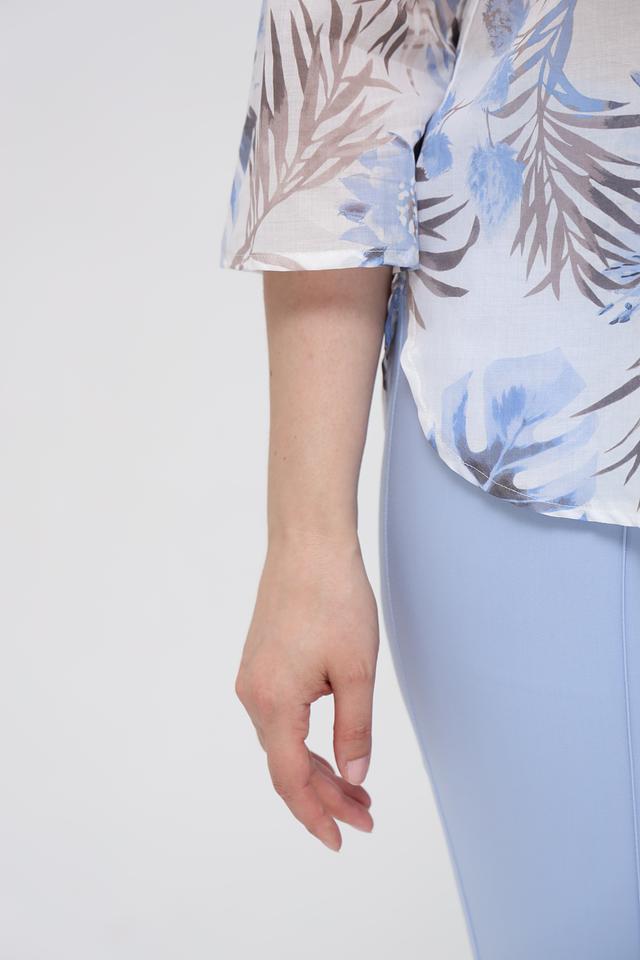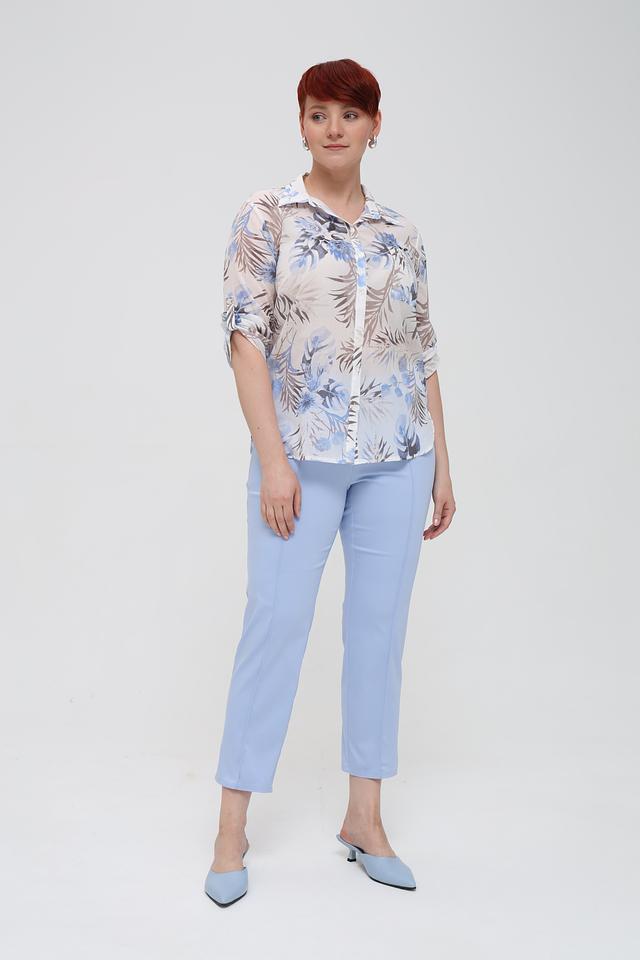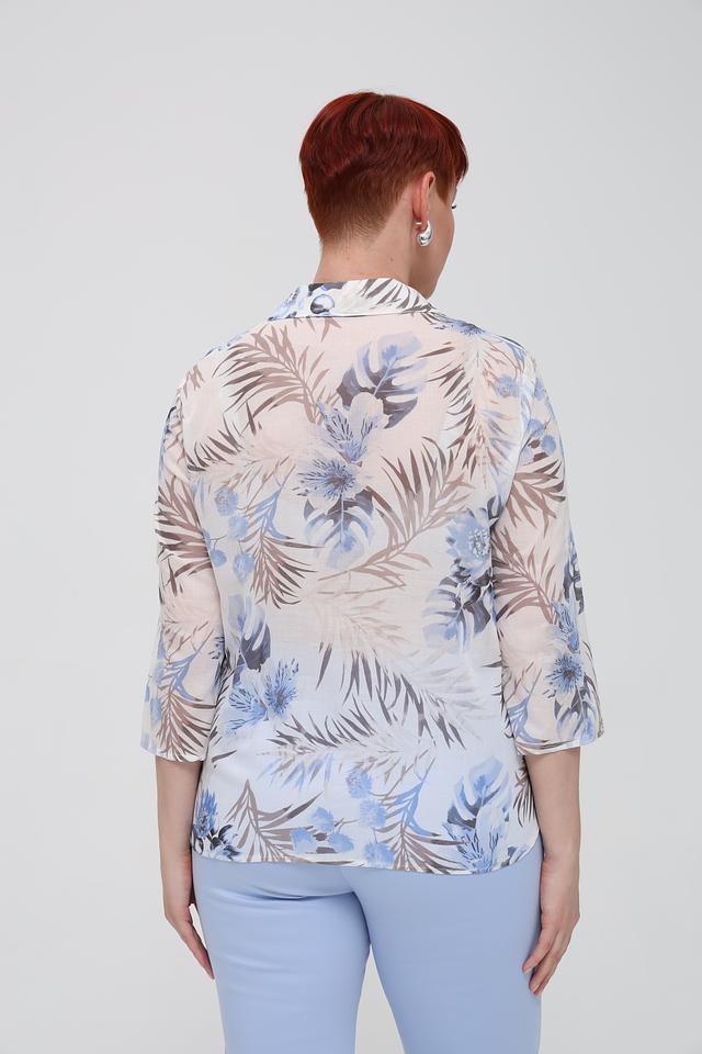 Основной цвет блузы – светло-бежевый, который служит идеальным фоном для яркого и красочного цветочного принта. Принт включает в себя различные оттенки синего, голубого и коричневого, создавая эффектный и запоминающийся образ.