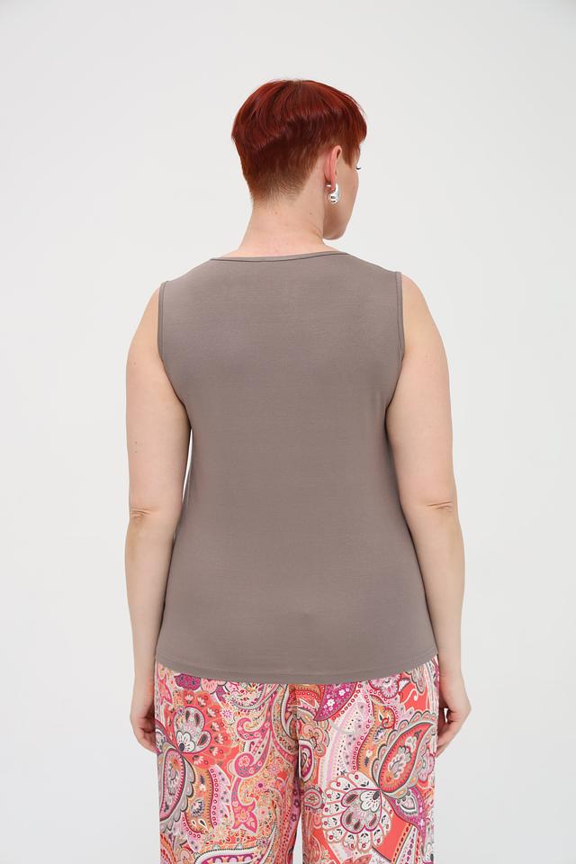 Топ имеет прямой крой и круглый вырез горловины. Благодаря составу – 93% вискоза и 7% эластан – он приятен к телу, хорошо драпируется и не сковывает движений. Эластан обеспечивает хорошую посадку по фигуре и сохранение формы после стирок.