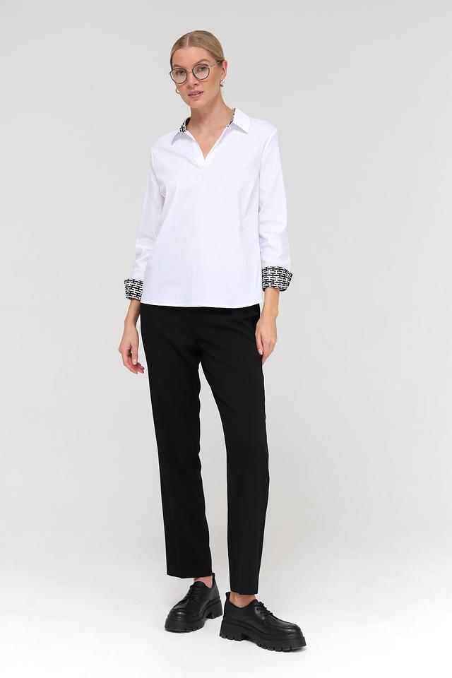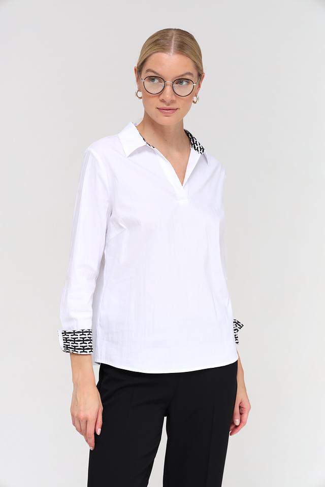 Белая блуза Frank Walder из хлопка с принтом на манжетах и воротнике. Модель выполнена из смесового состава с добавлением полиамида и эластана для комфорта и сохранения формы. Состав: хлопок 76%, полиамид 22%, эластан 2%