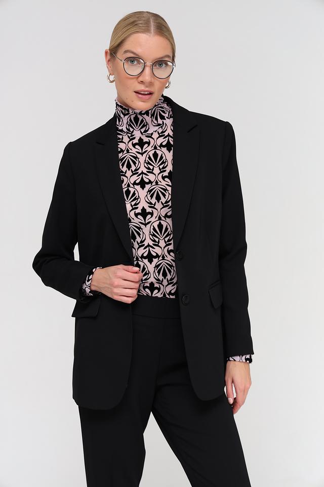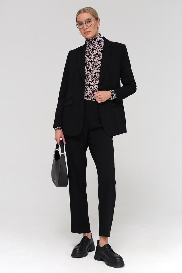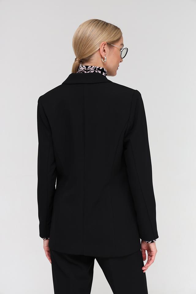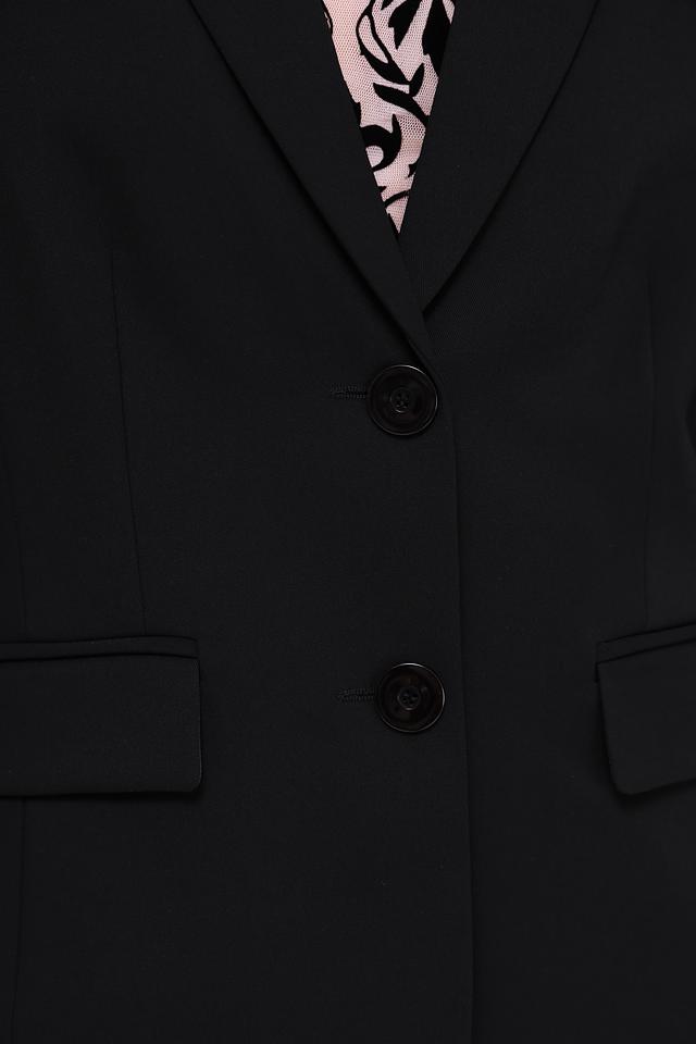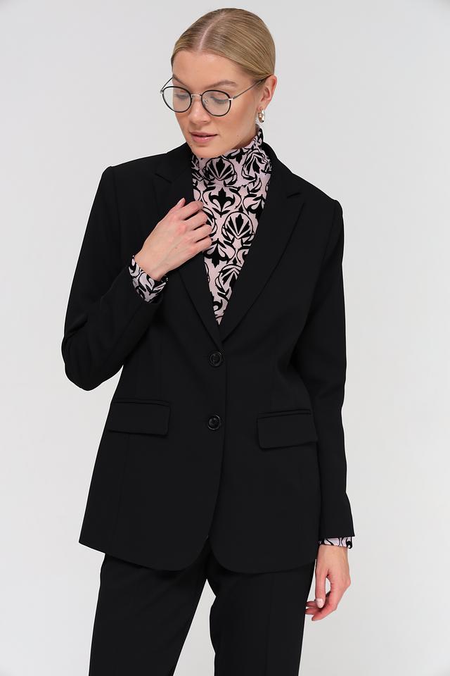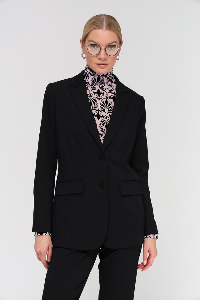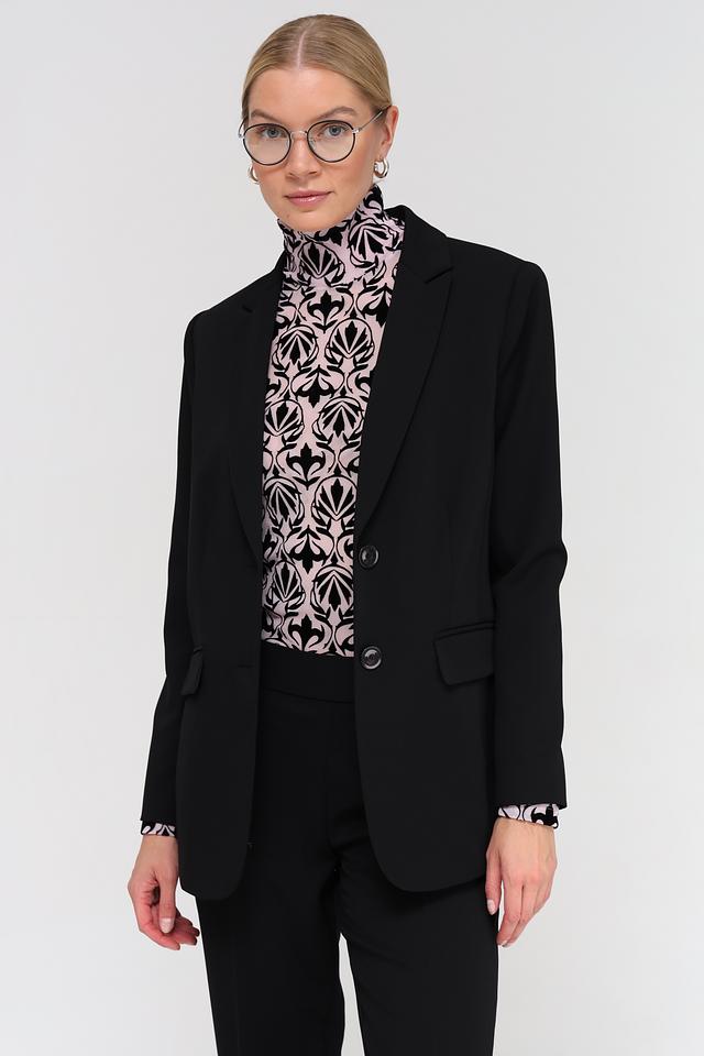 Жакет выполнен из высококачественного полиэстера, что обеспечивает ему долговечность и простоту в уходе. Отложной воротник лацканом добавляет образу строгости и деловитости.