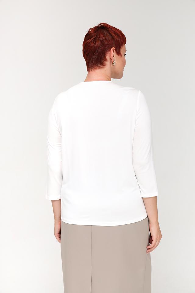 Рукава блузы – три четверти, что делает ее универсальной для любого времени года. Воротник – округлый, что придает образу мягкость и женственность.