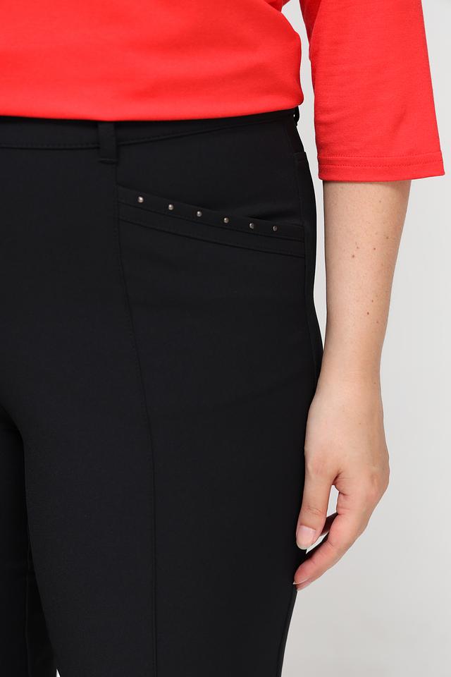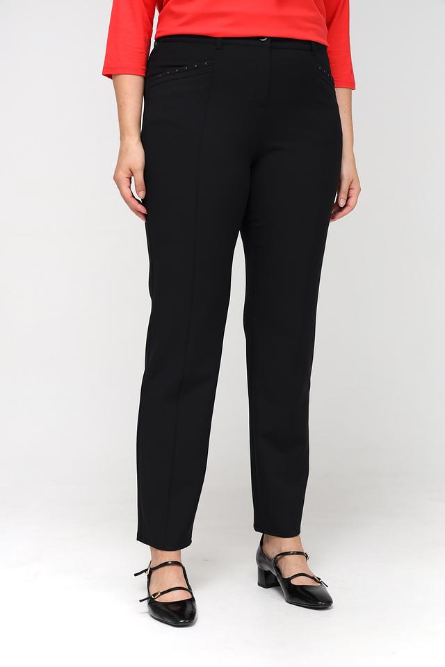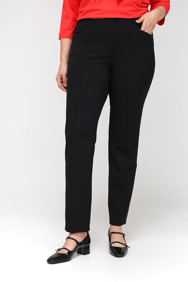 Брюки имеют прямой крой, который подчеркивает фигуру и обеспечивает свободу движений. Декоративные элементы в виде небольших страз на карманах придают изделию изысканность и индивидуальность.