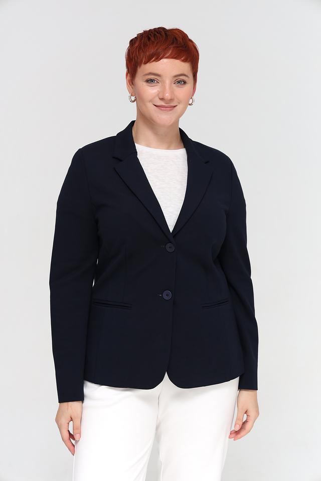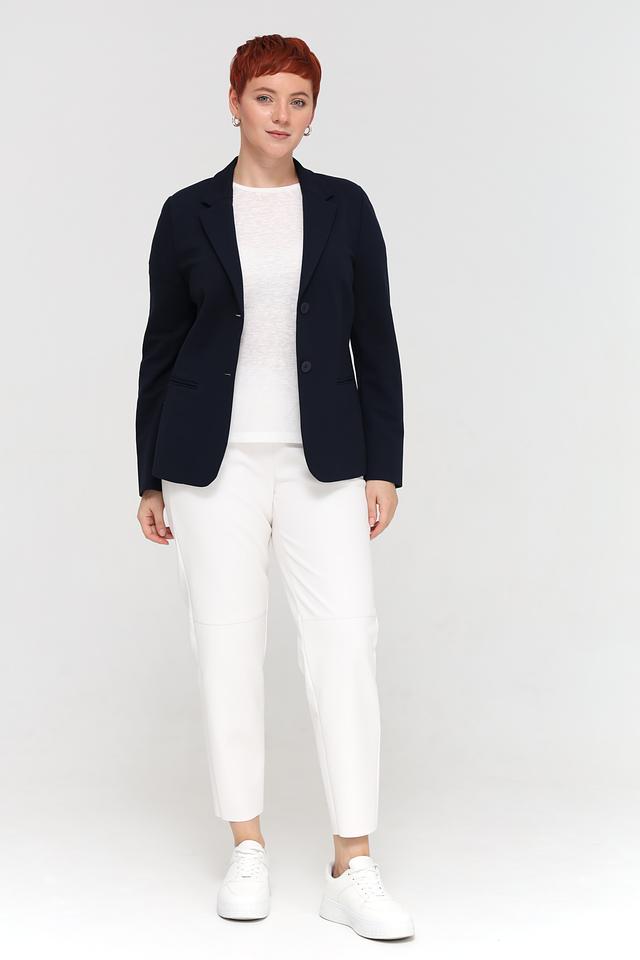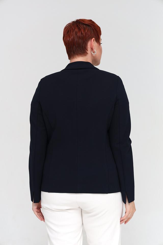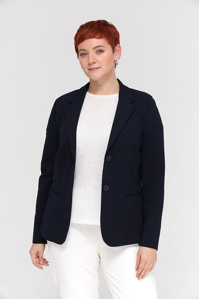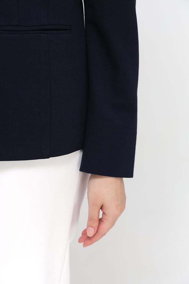 Жакет имеет приталенный силуэт, который подчеркивает фигуру, и однобортную застёжку на три пуговицы. Лацканы классической формы добавляют жакету строгости и элегантности. Накладные карманы обеспечивают функциональность и удобство.