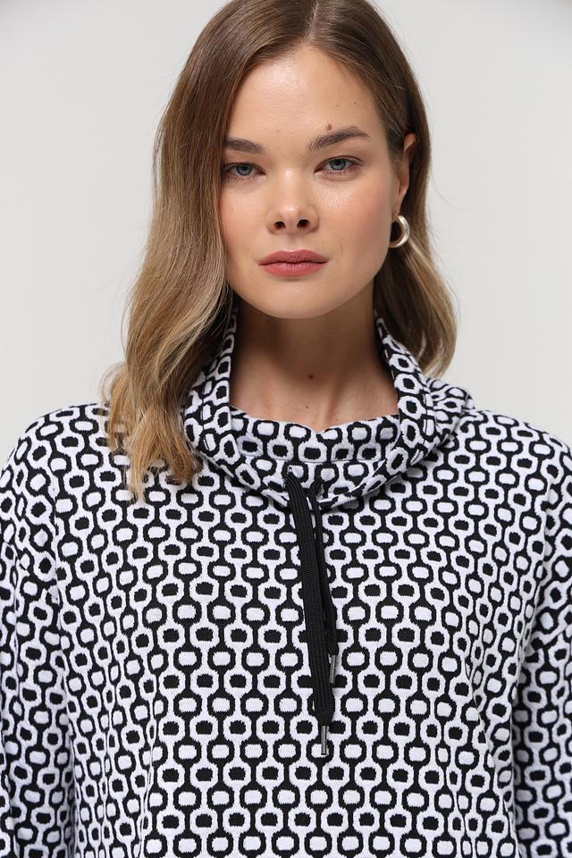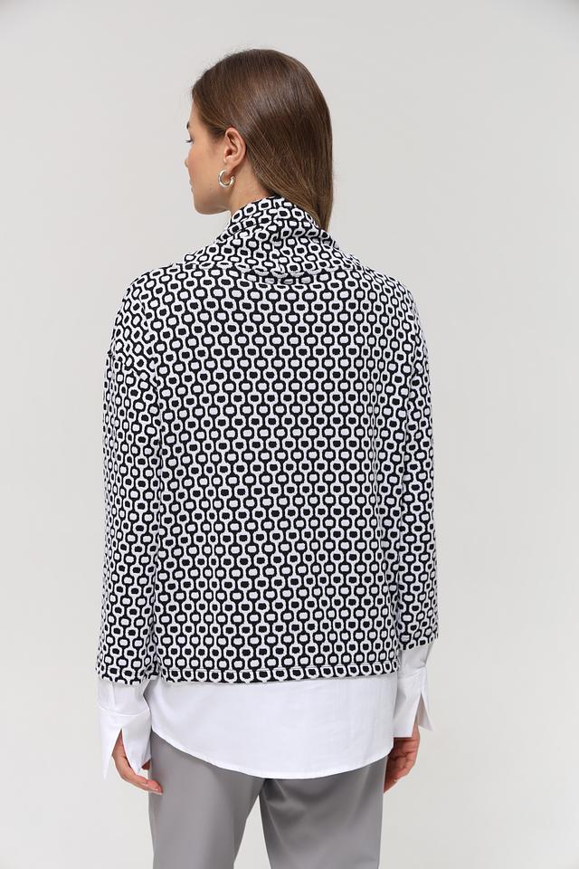 Женский пуловер Frank Walder чёрно-белого цвета с геометрическим принтом и высоким воротником-стойкой. Модель выполнена из мягкого и приятного к телу сочетания полиэстера, хлопка и эластана, обеспечивающего комфорт и свободу движений. Состав: полиэстер 51%, хлопок 46%, эластан 3%