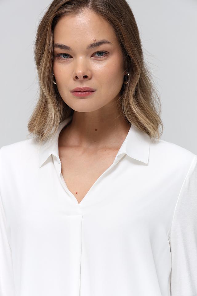 Блуза имеет прямой крой, длинные рукава и аккуратный воротник. Слегка заниженная линия плеч придает ей более расслабленный и современный вид. Небольшая сборка на груди создает легкую драпировку, добавляя блузе женственности.