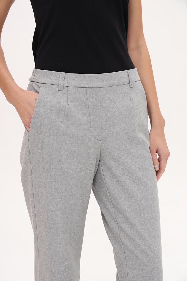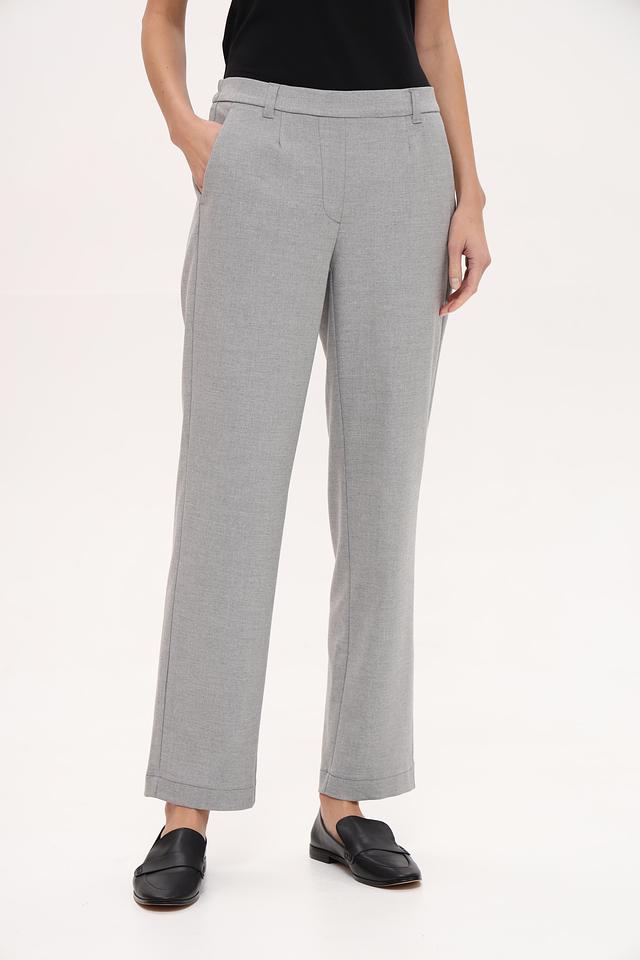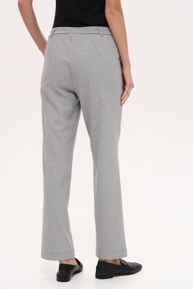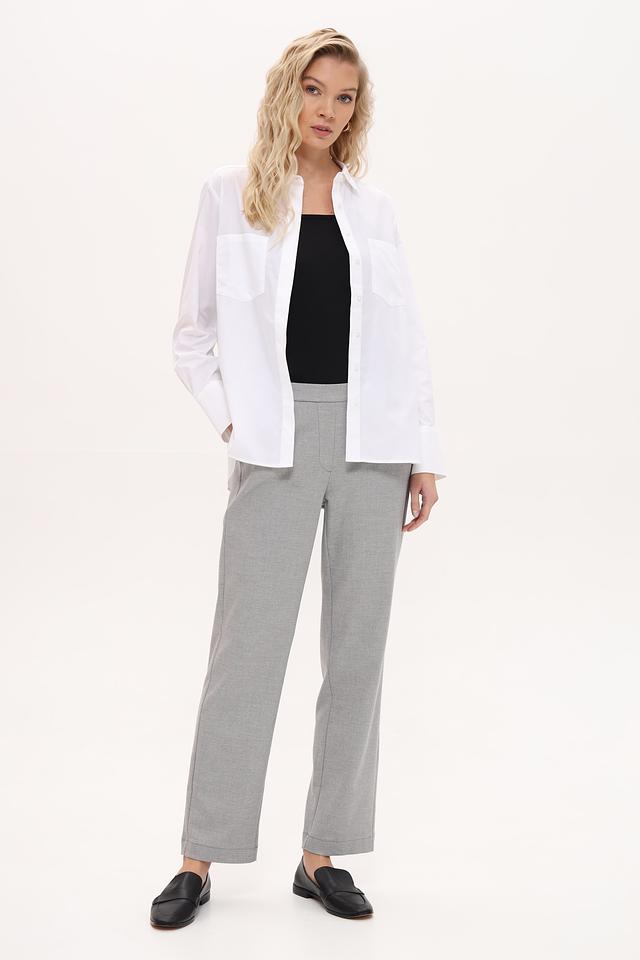 Брюки имеют прямой крой и классическую посадку по фигуре. Эластичный пояс обеспечивает комфортную посадку и свободу движений. Ткань сочетает в себе полиэстер, вискозу и эластан, что делает брюки приятными на ощупь, устойчивыми к сминанию и обеспечивающими хорошую воздухопроницаемость.