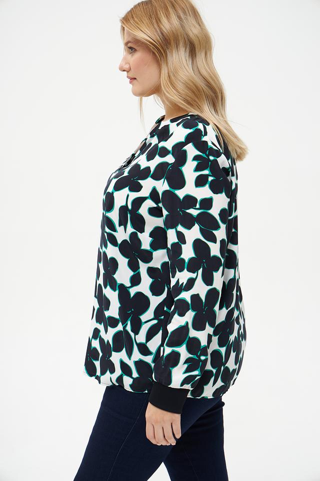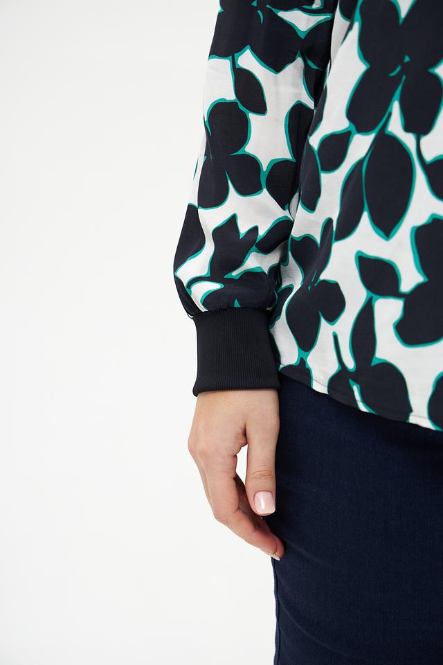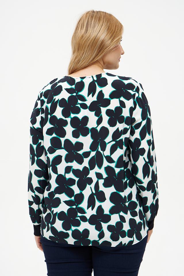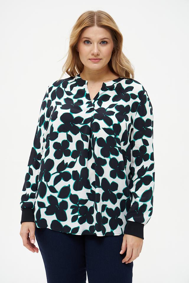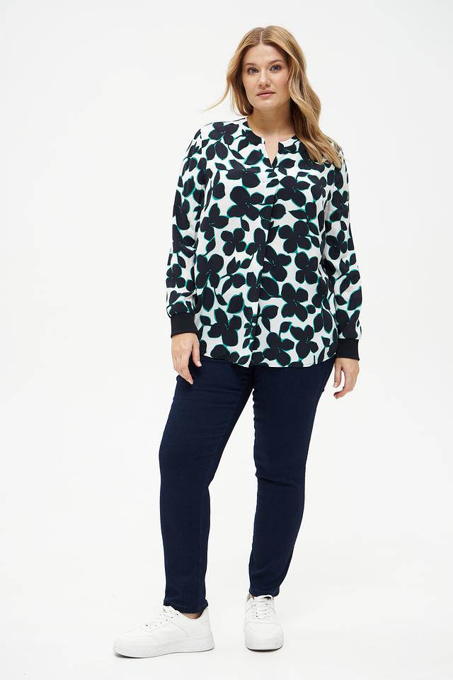 Блуза имеет свободный крой и длинные рукава с манжетами. V-образный вырез горловины добавляет образу элегантности. Основной цвет блузы – белый, украшенный ярким и выразительным цветочным принтом в черных и бирюзовых тонах.