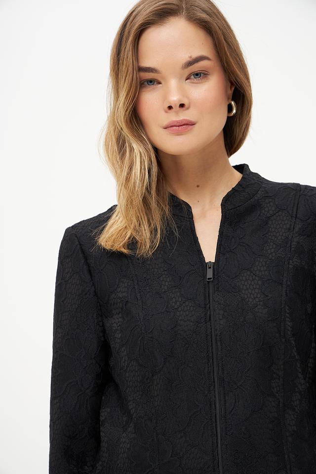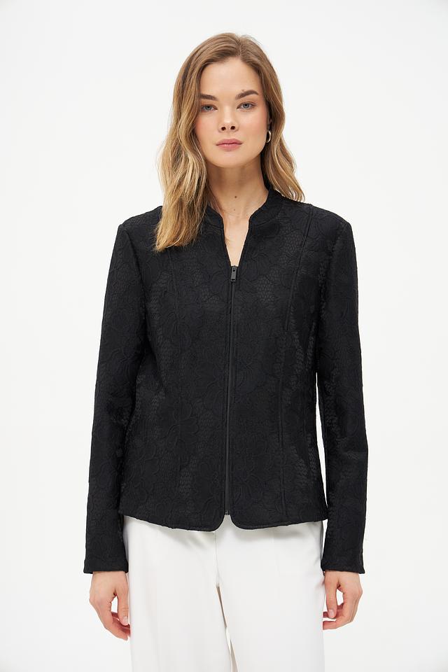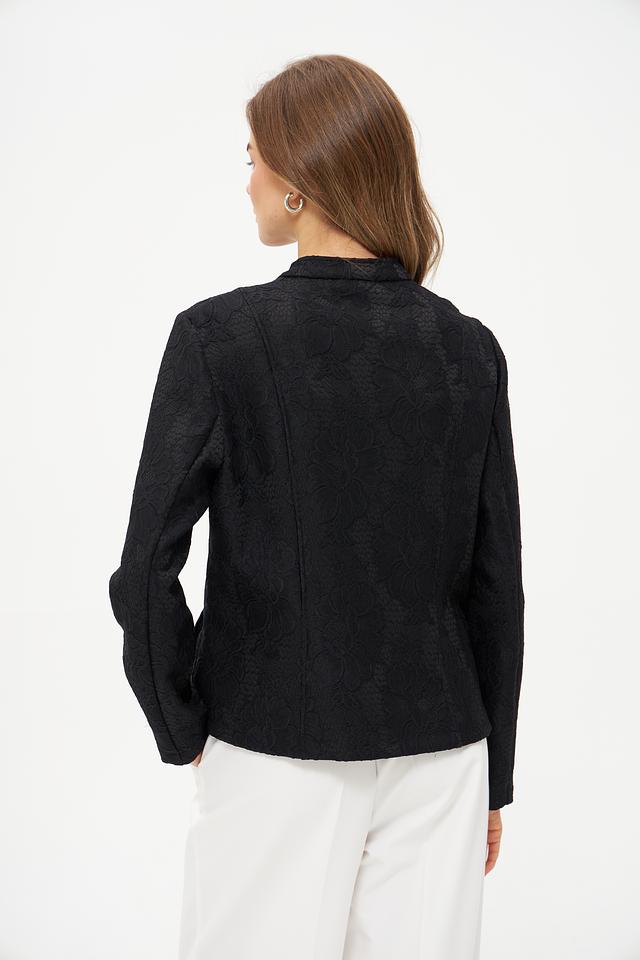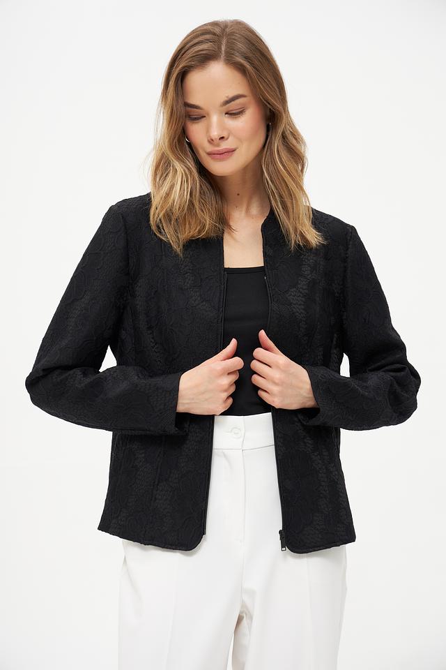 Модель застегивается на молнию, что обеспечивает удобство и практичность. Жакет имеет длинные рукава и воротник-стойку. Состав ткани: 64% полиэстер, 30% полиамид, 6% эластан. Благодаря этому сочетанию материалов, жакет хорошо держит форму, не мнется и приятен к телу.