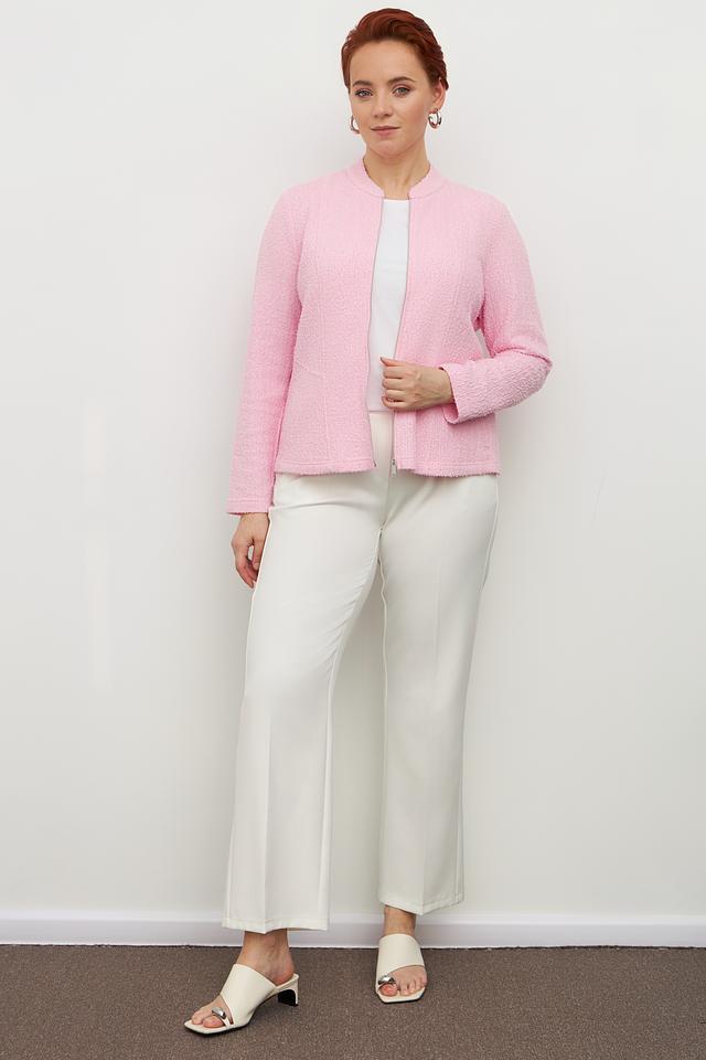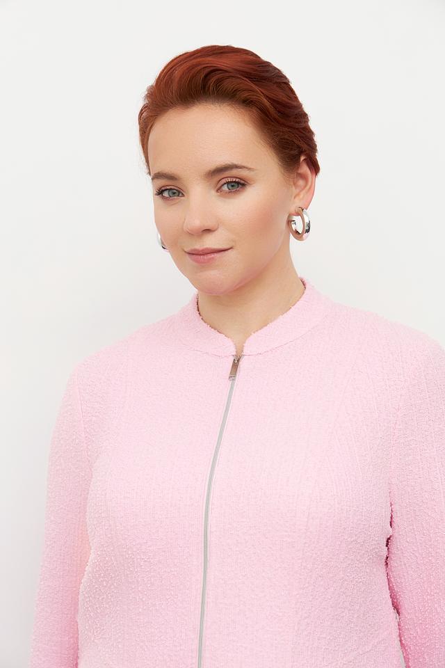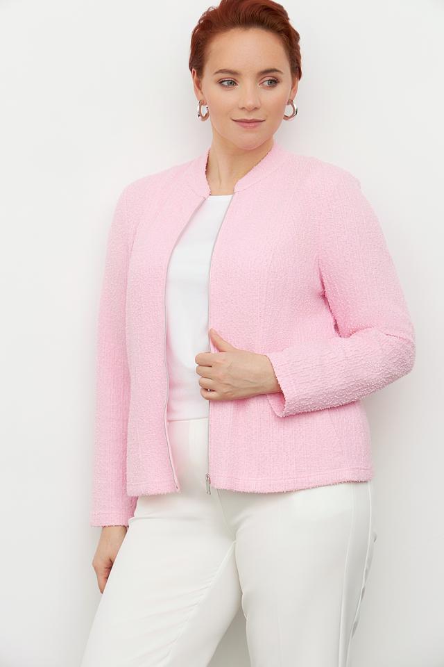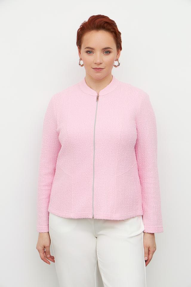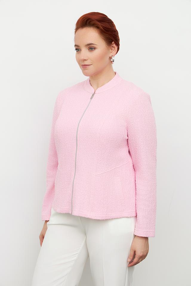 Розовый жакет Frank Walder из фактурного материала. Модель на молнии с воротником-стойкой и длинными рукавами. Состав: полиэстер, хлопок, вискоза. Состав: полиэстер 51%, хлопок 29%, вискоза 20%