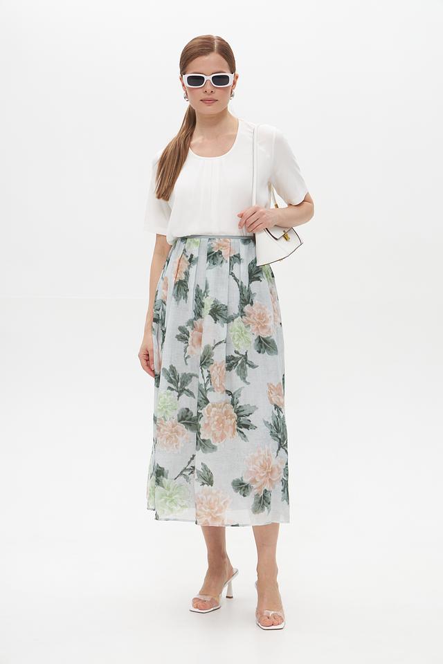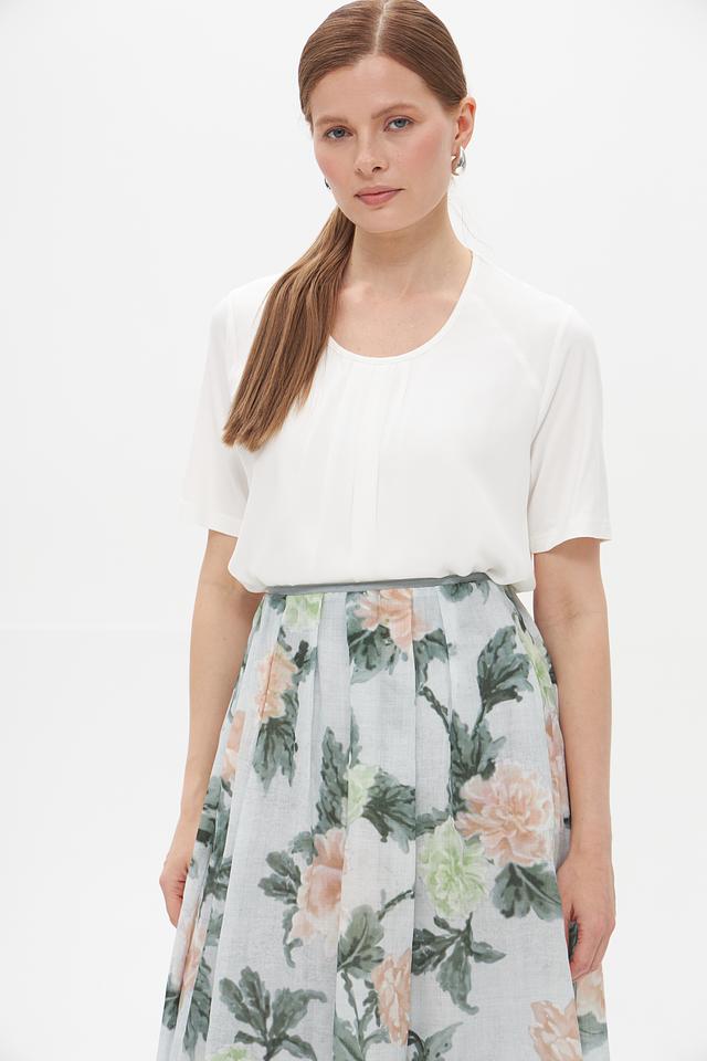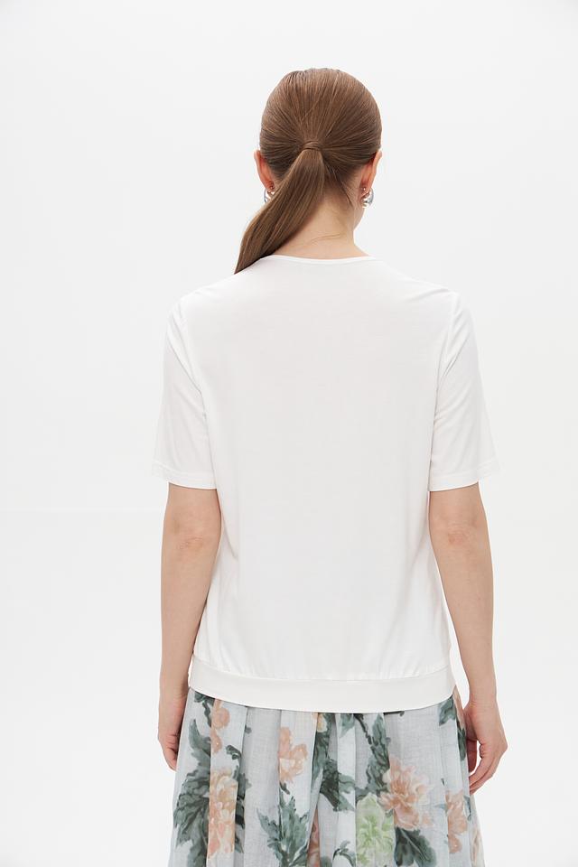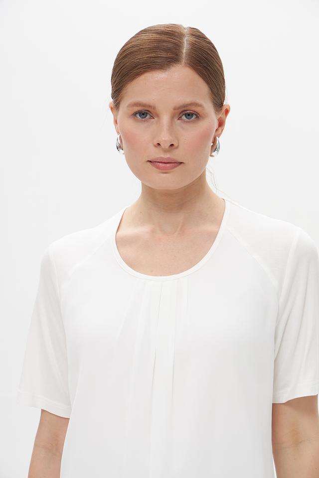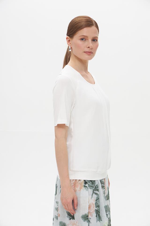 Модель имеет прямой свободный крой, короткие рукава и аккуратный круглый вырез. Передняя часть блузки украшена вертикальной драпировкой, придающей ей элегантность и изысканность.