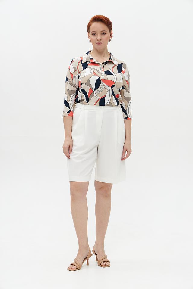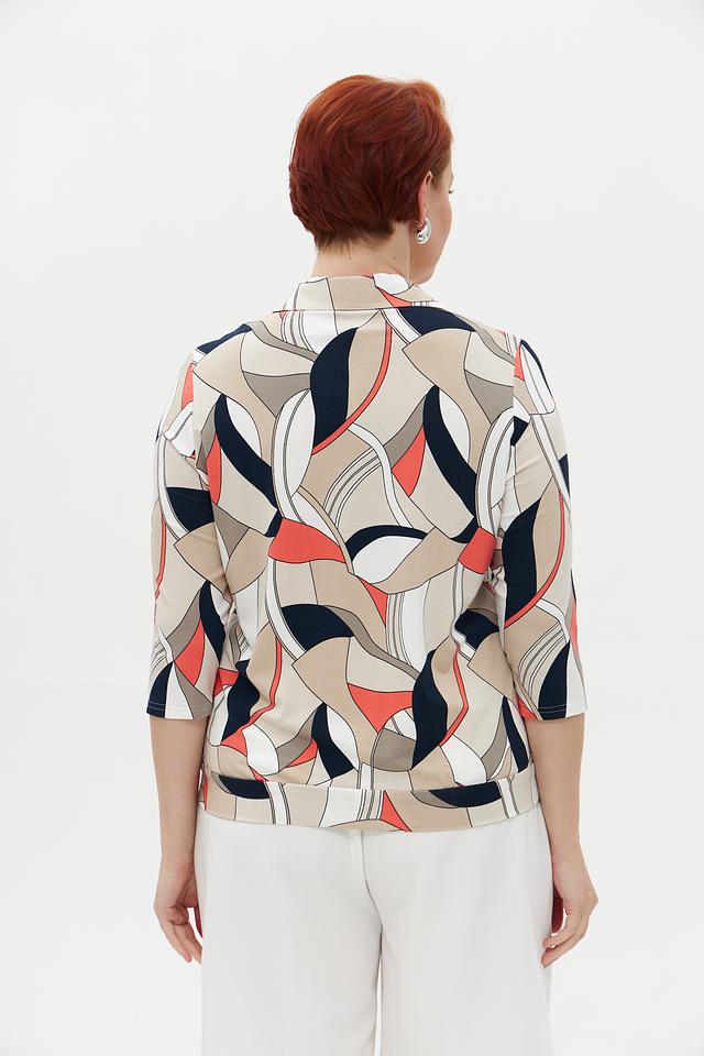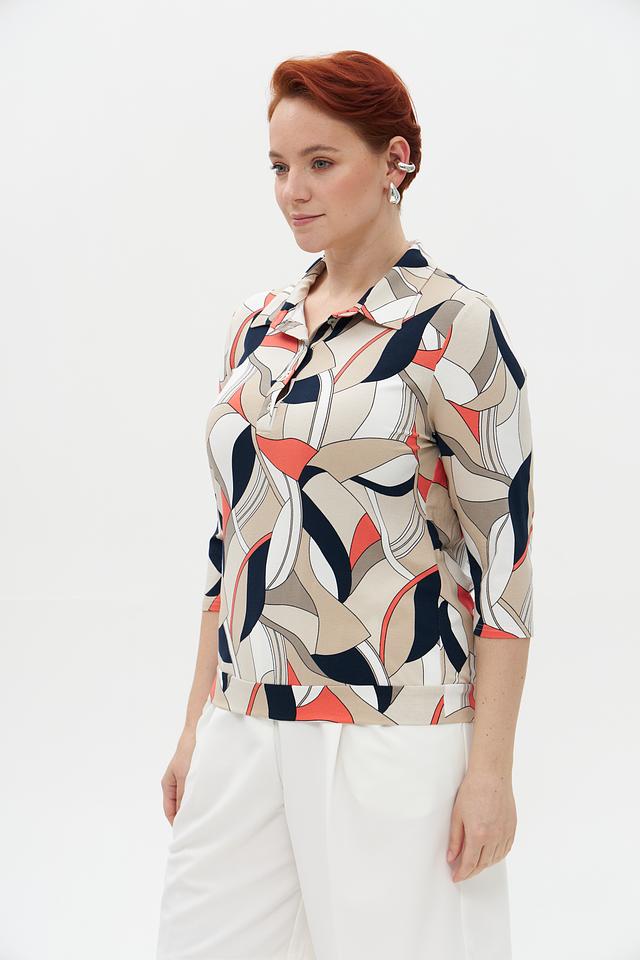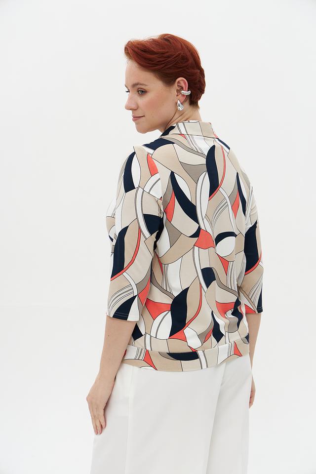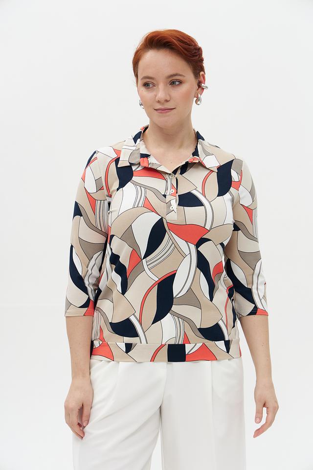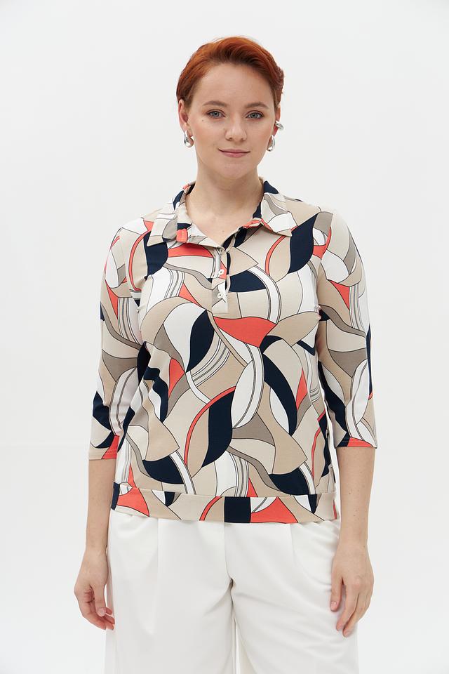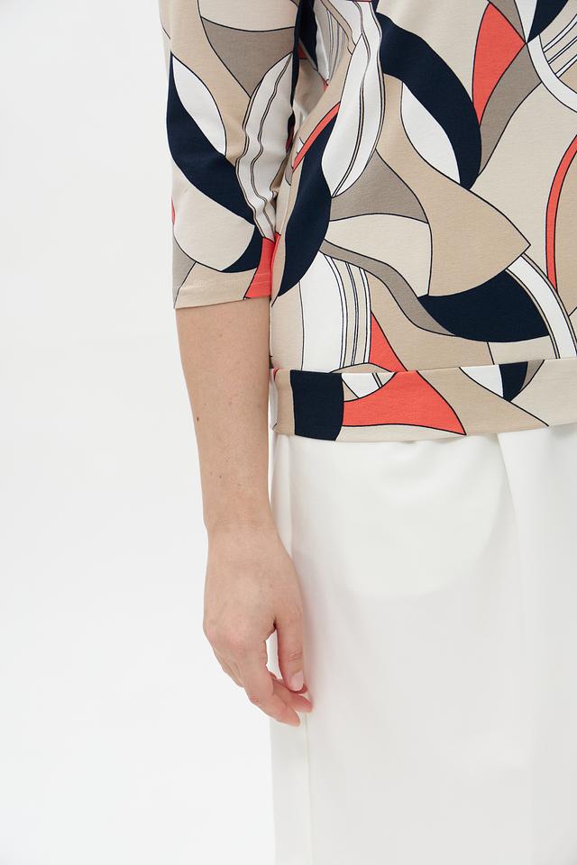 Футболка имеет прямой крой и короткий рукав 3/4, что делает ее универсальной для различных образов. Главной особенностью модели является яркий геометрический принт, выполненный в бежевых, коричневых, оранжевых и темно-синих тонах. Такой рисунок добавит изюминку и индивидуальность вашему стилю.