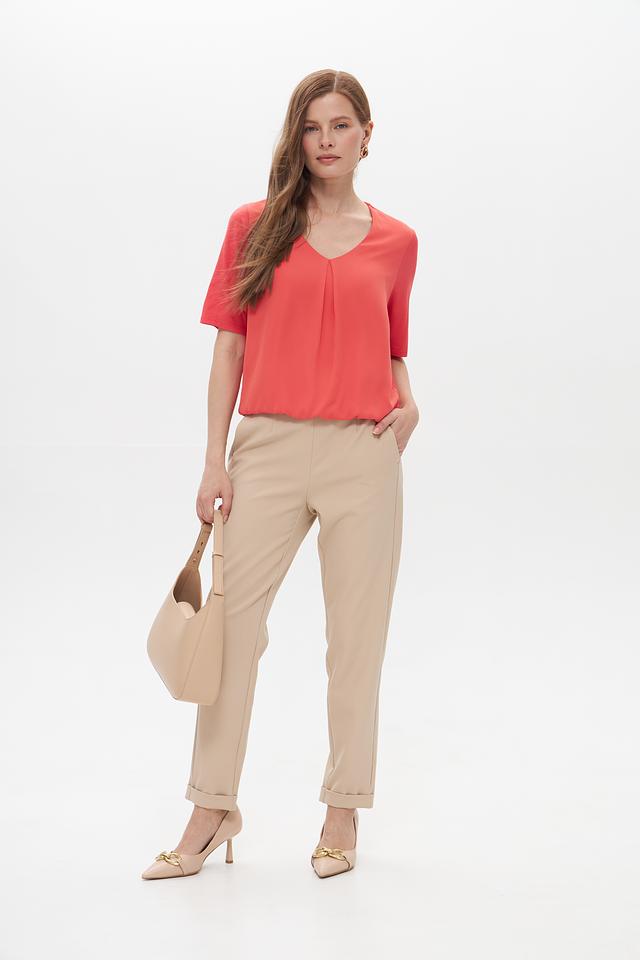 - Элегантный дизайн: V-образный вырез визуально удлиняет шею, а деликатные складки спереди добавляют изысканности и создают эффект струящегося силуэта. Короткий рукав и эластичная кулиска по низу подчеркивают фигуру, обеспечивая при этом полную свободу движений.