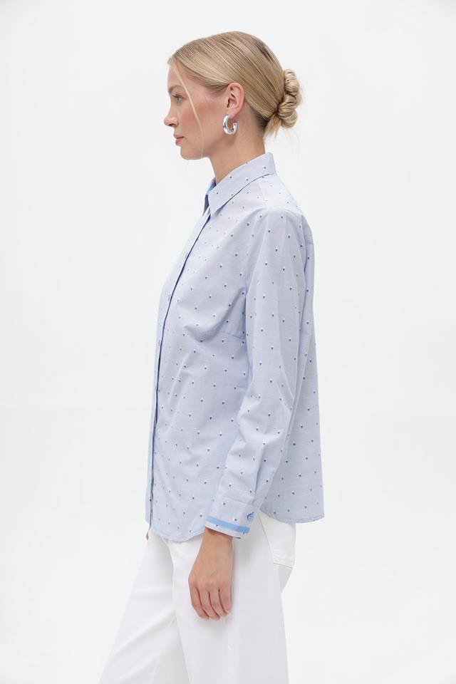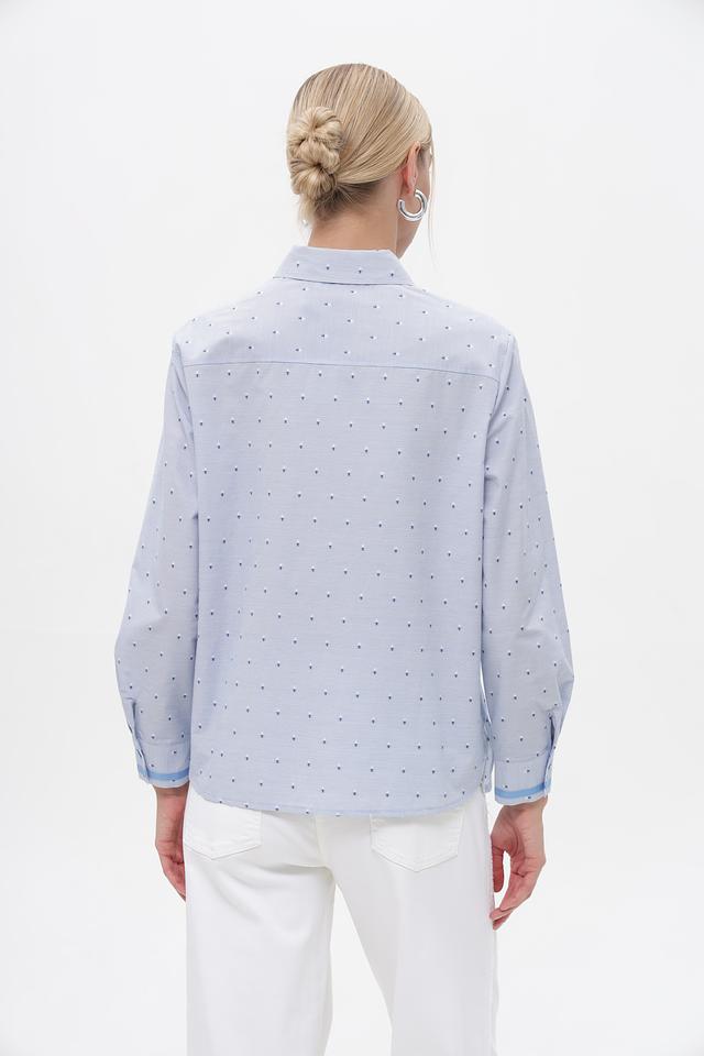 Женская блузка Frank Walder голубого цвета с принтом в полоску и мелкий горошек. Изготовлена из хлопка с добавлением полиэстера для комфорта и практичности. Состав: хлопок 63%, полиэстер 37%