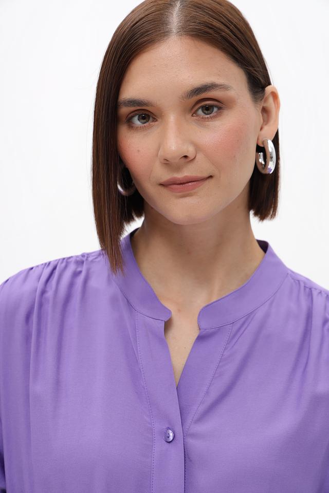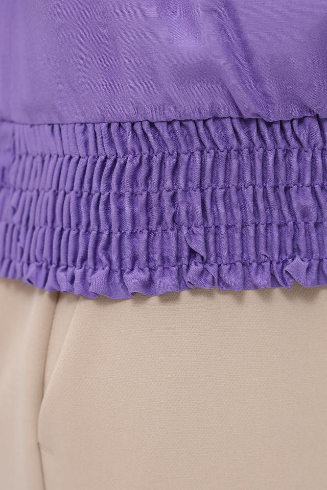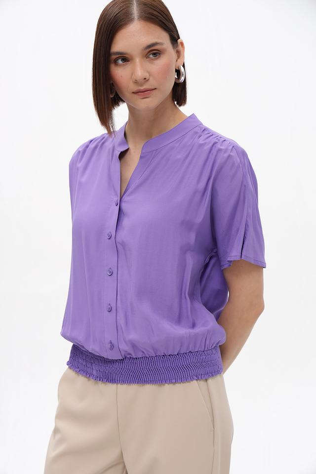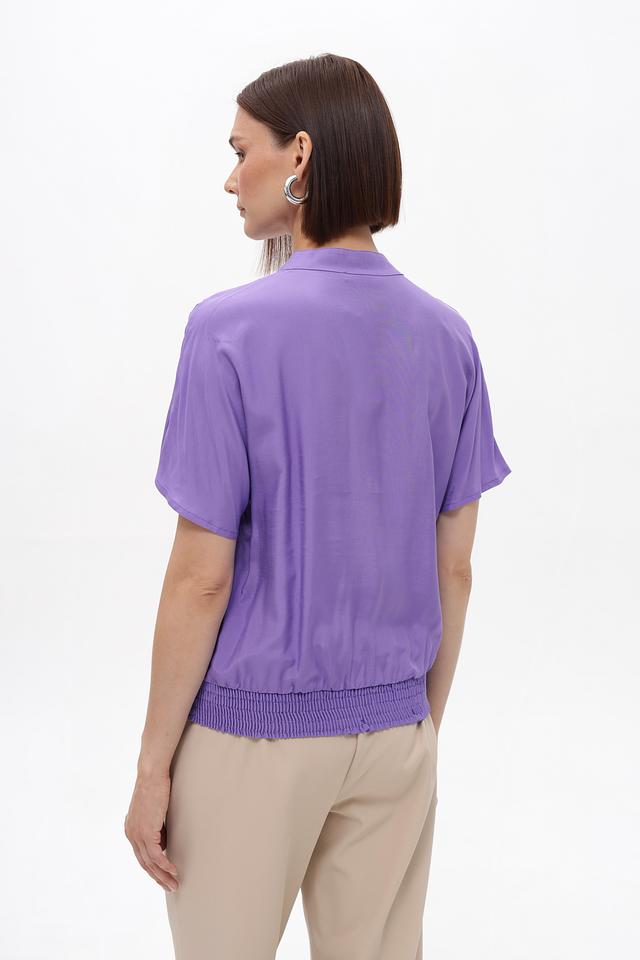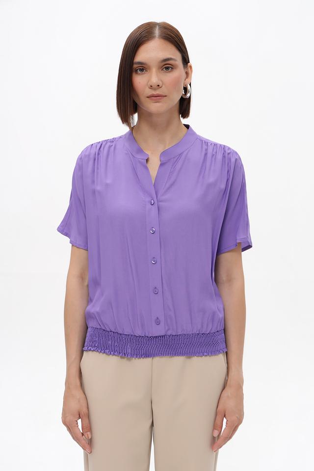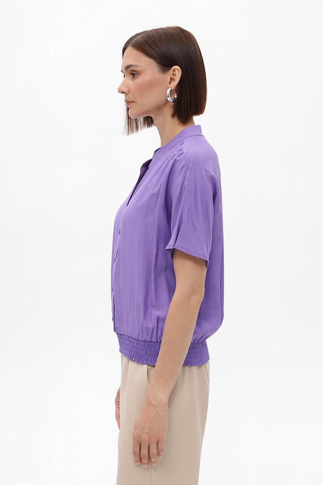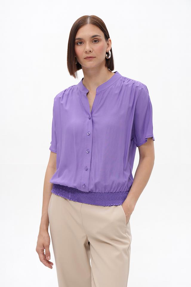 Модель имеет лавандовый цвет, короткие рукава и V-образный вырез. Передняя часть блузки украшена рядом небольших пуговиц. Особый акцент сделан на сборке по низу изделия, которая придает блузке более женственный и изящный вид.