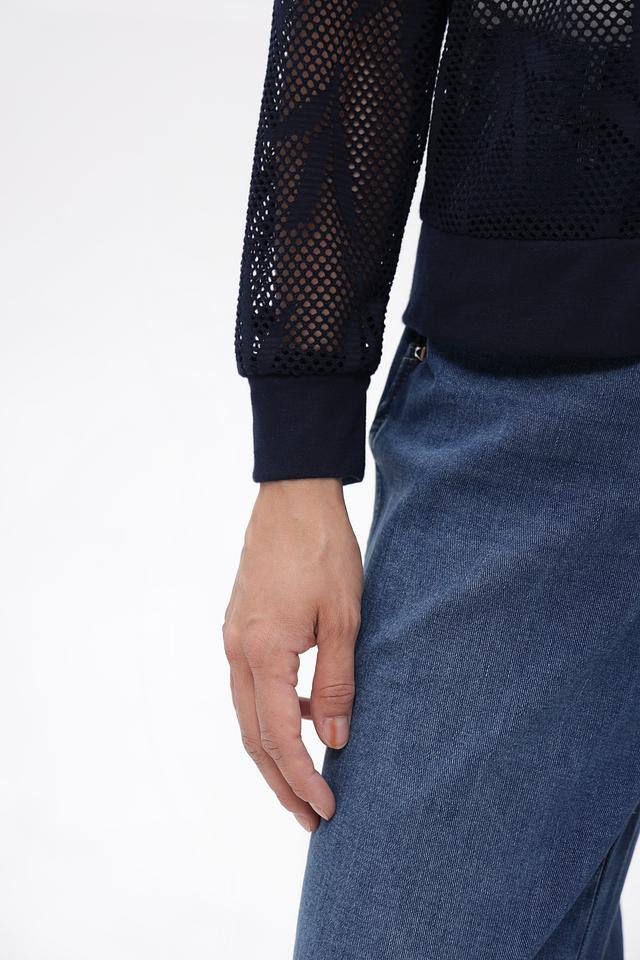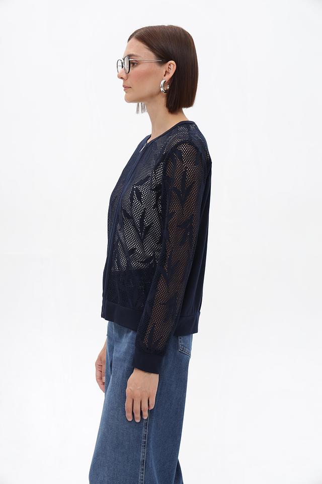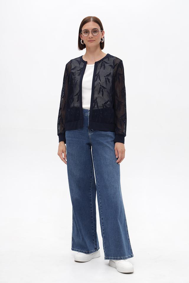 Этот жакет от Frank Walder станет ярким акцентом вашего образа. Модель выполнена в глубоком синем цвете и отличается оригинальным дизайном благодаря кружевной вставке на плечах и рукавах.