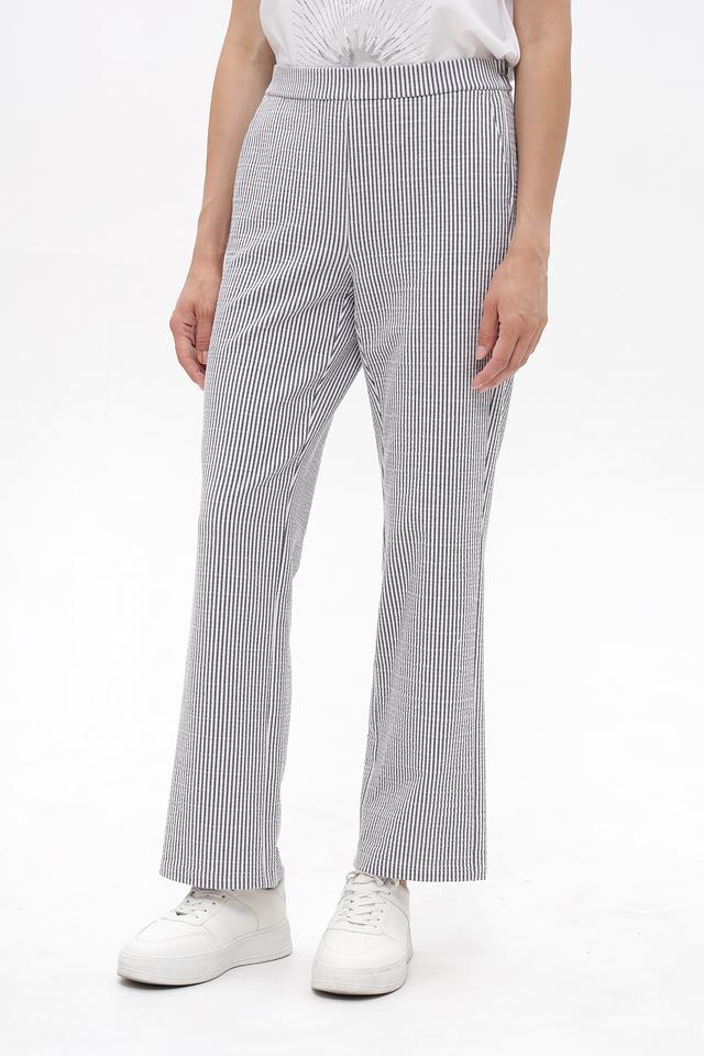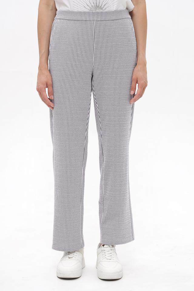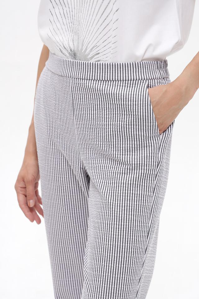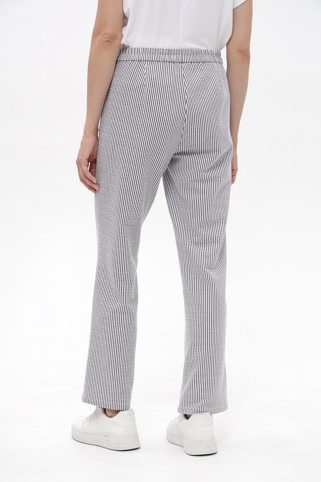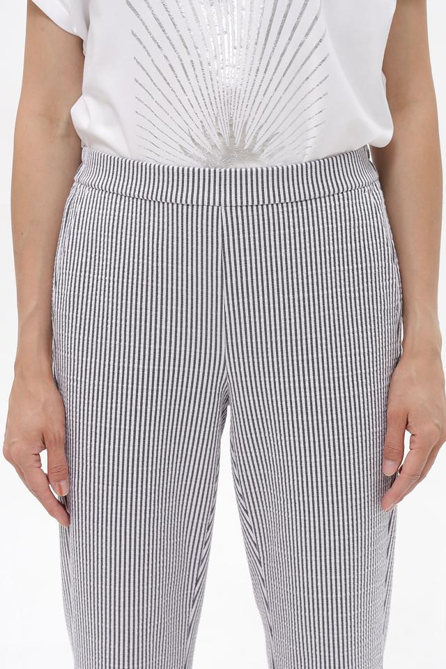 Женские брюки от Frank Walder выполнены в сине-белую полоску. Модель имеет прямую посадку и зауженный к низу силуэт. Брюки дополнены эластичным поясом, обеспечивающим комфортную посадку.