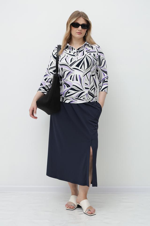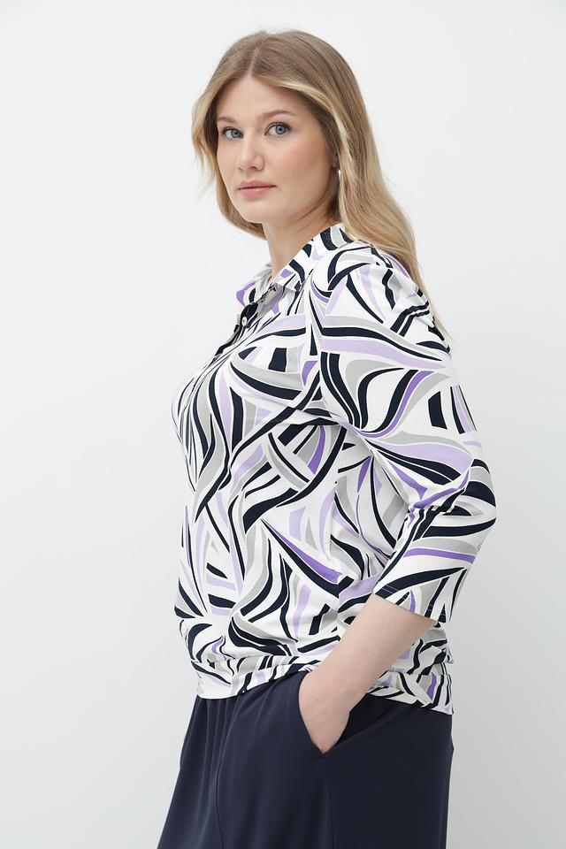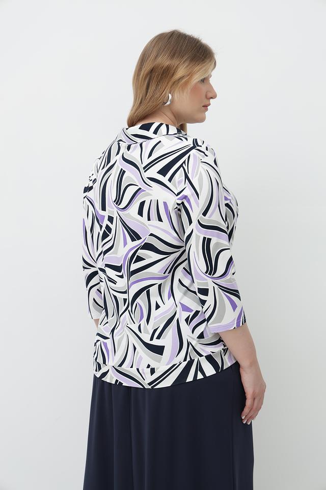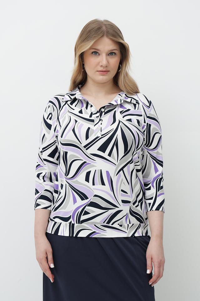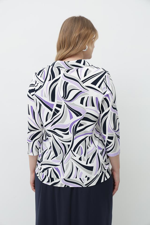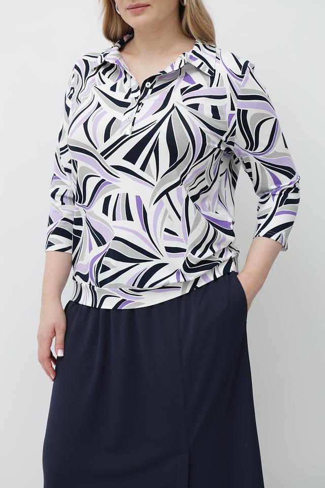 Особенностью данной модели является яркий и запоминающийся абстрактный принт, выполненный в сочетании белого, фиолетового и черного цветов. Футболка имеет удобный V-образный вырез и рукава 3/4, что делает ее универсальной для различных образов.