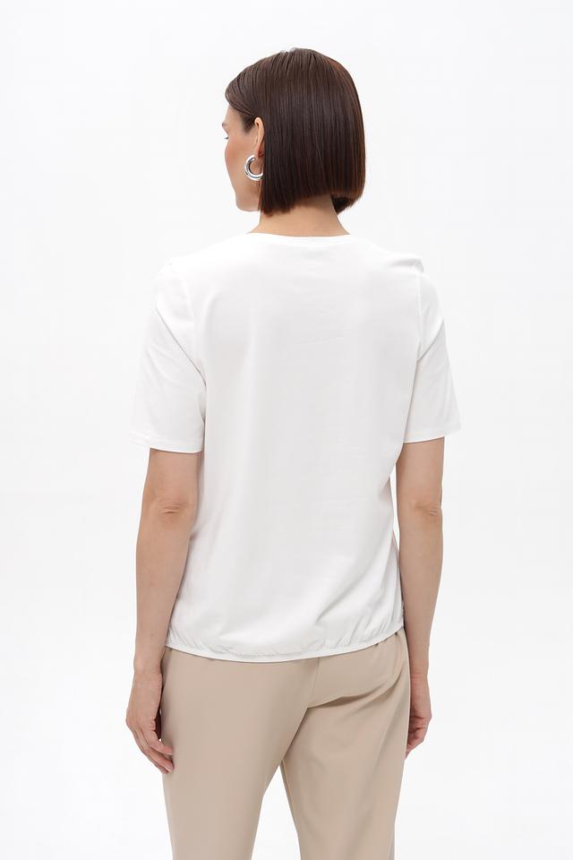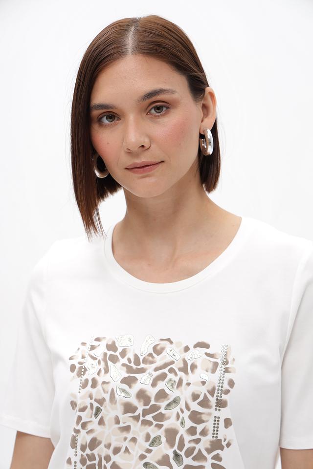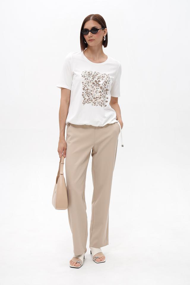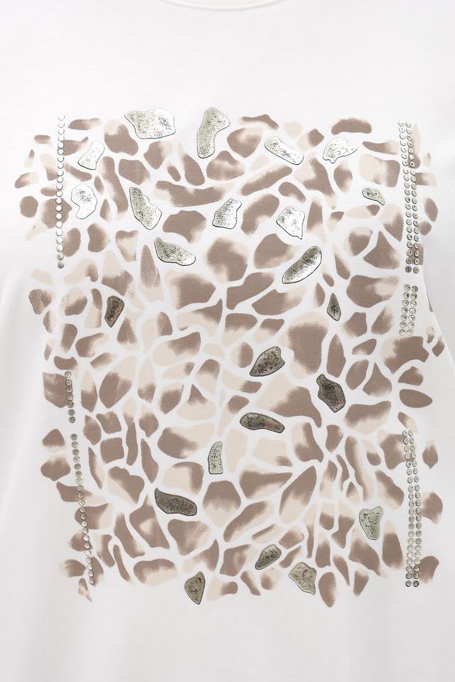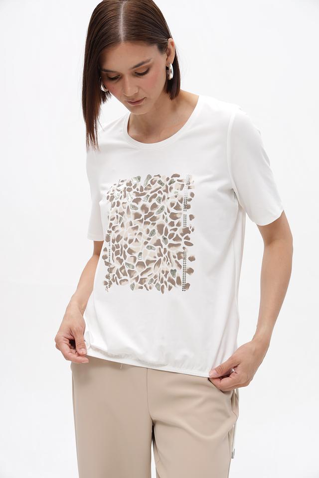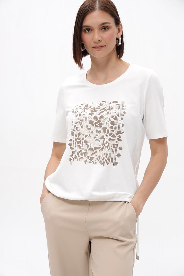 Основной цвет футболки – белый, а передняя часть украшена стильным принтом в коричнево-бежевой гамме. Принт выполнен в виде абстрактного рисунка, придающего изделию оригинальность и современный вид.