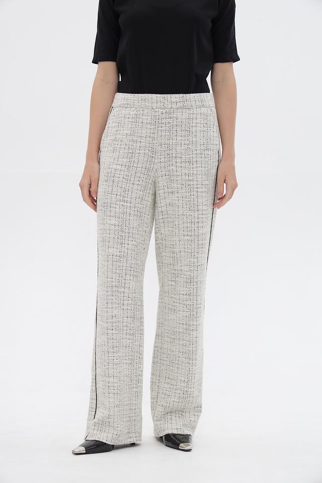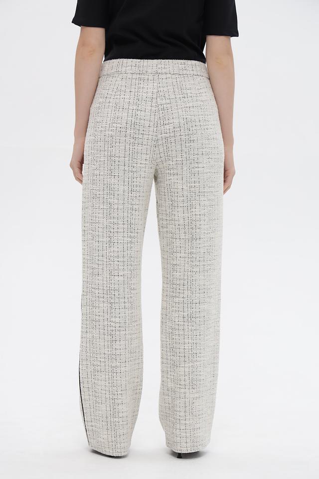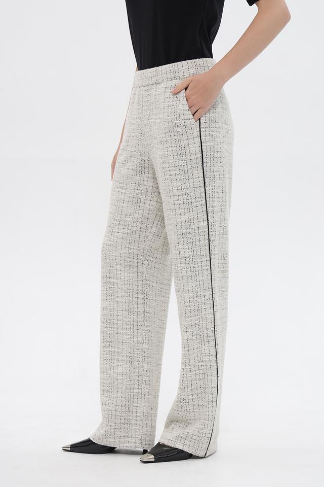 Брюки имеют удобную посадку благодаря эластичному поясу, что обеспечивает комфорт в течение всего дня. Контрастные черные боковые полосы добавляют образу динамичности и акцентируют внимание на силуэте. Крой брюк – широкие, обеспечивающие свободу движений и современный вид.