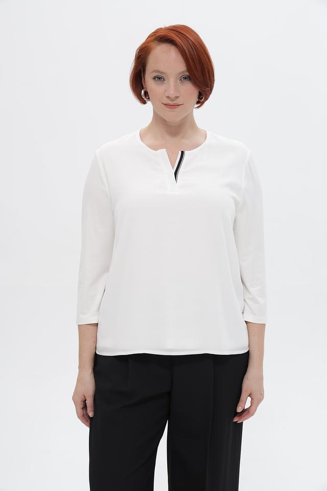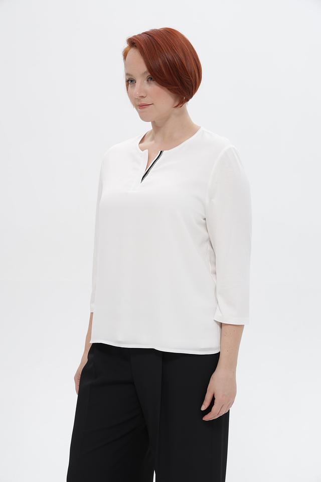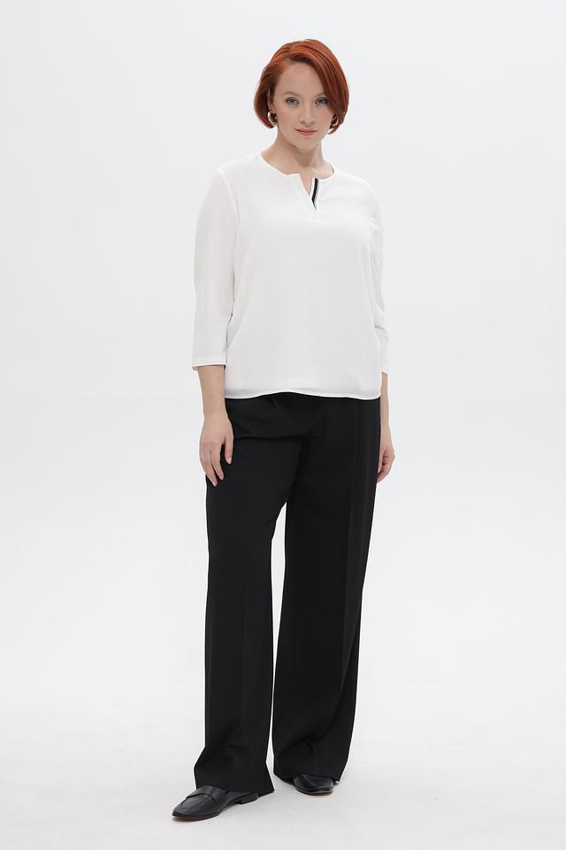Блузка имеет V-образный вырез горловины, украшенный черной тесьмой, которая добавляет изделию изысканности и оригинальности. Рукава длиной 3/4 делают ее универсальной для любого времени года.