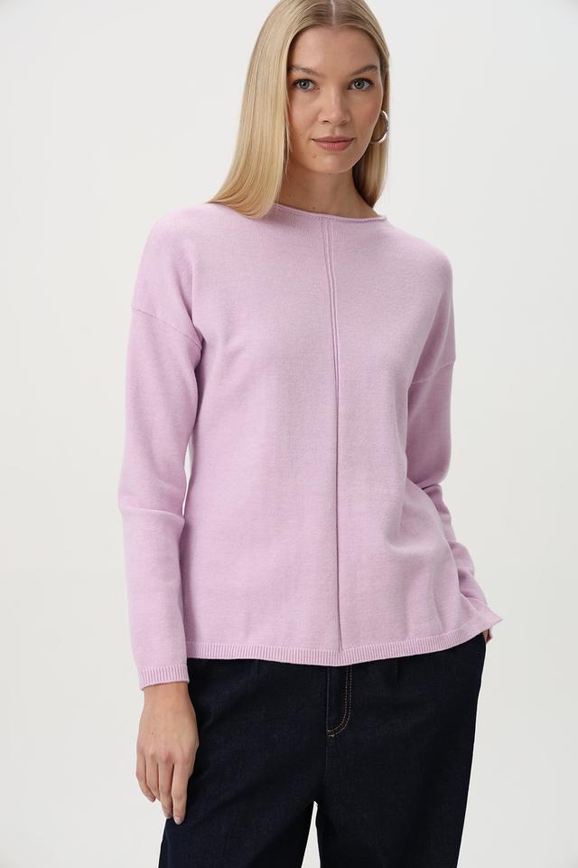 Пуловер имеет классический округлый вырез горловины и длинные рукава с манжетами. Передняя часть изделия украшена вертикальной вытачкой, которая визуально вытягивает силуэт и добавляет изысканности. Текстура трикотажа придает изделию мягкость и уют.