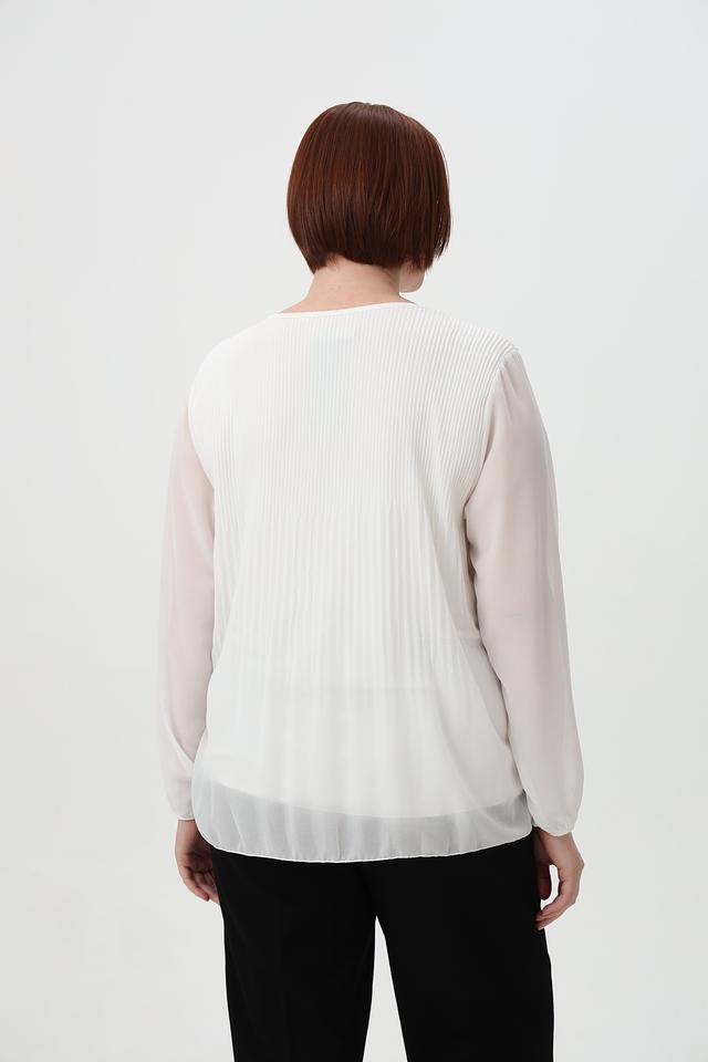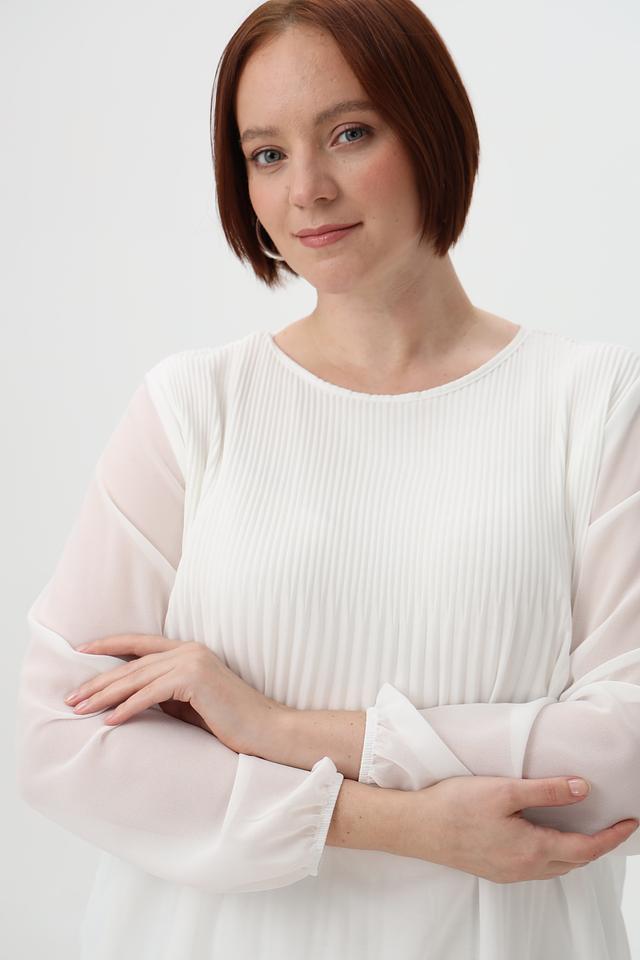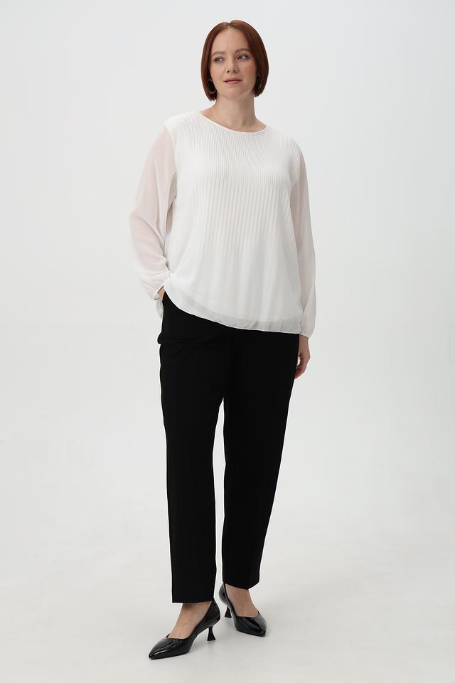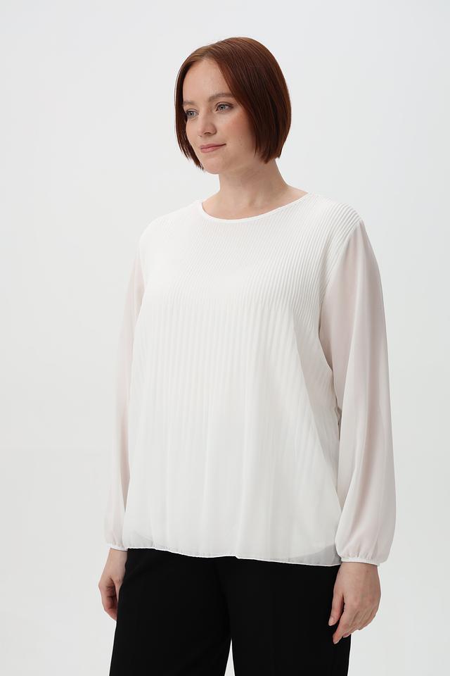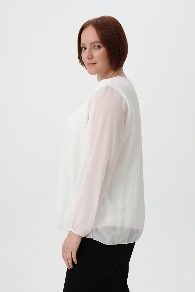 Модель отличается плиссированным передним полотном, которое придает ей элегантный и женственный вид. Рукава блузки длинные, слегка расклешенные к запястью, выполнены из полупрозрачной ткани.