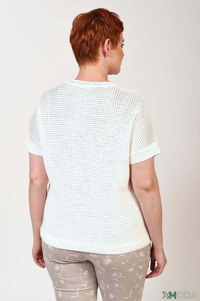 Особенностью данной модели является ажурная текстура, которая придает ей легкость и воздушность. Короткие рукава и округлый вырез горловины делают блузу идеальной для теплой погоды. Отделка горловины выполнена в виде небольшого кружева, добавляющего изящества.