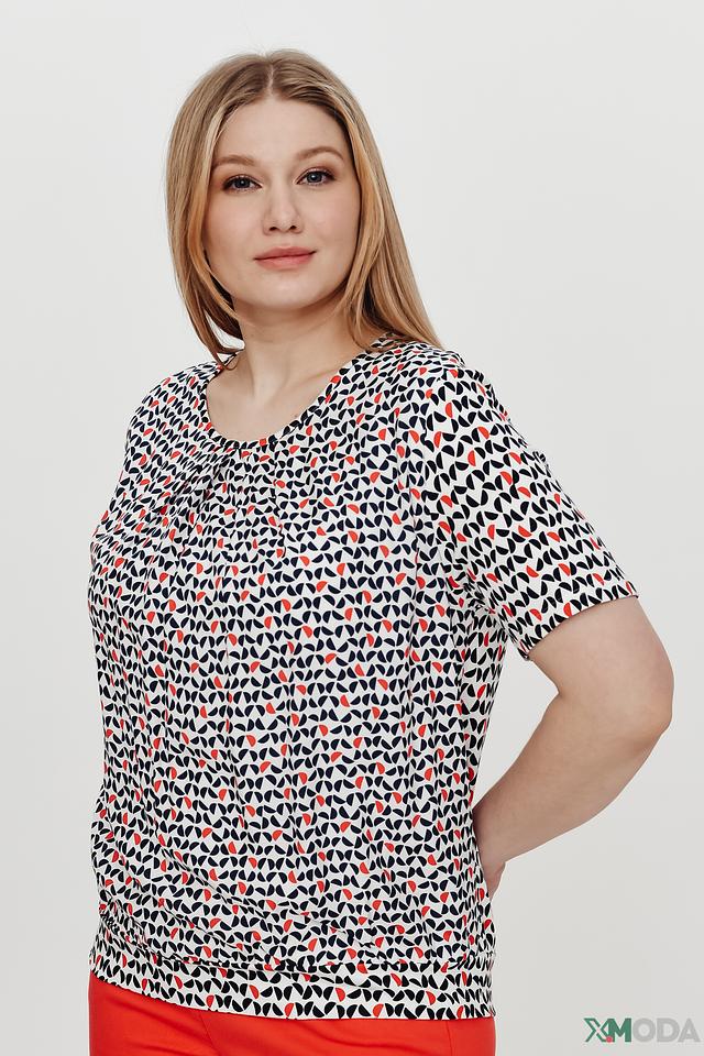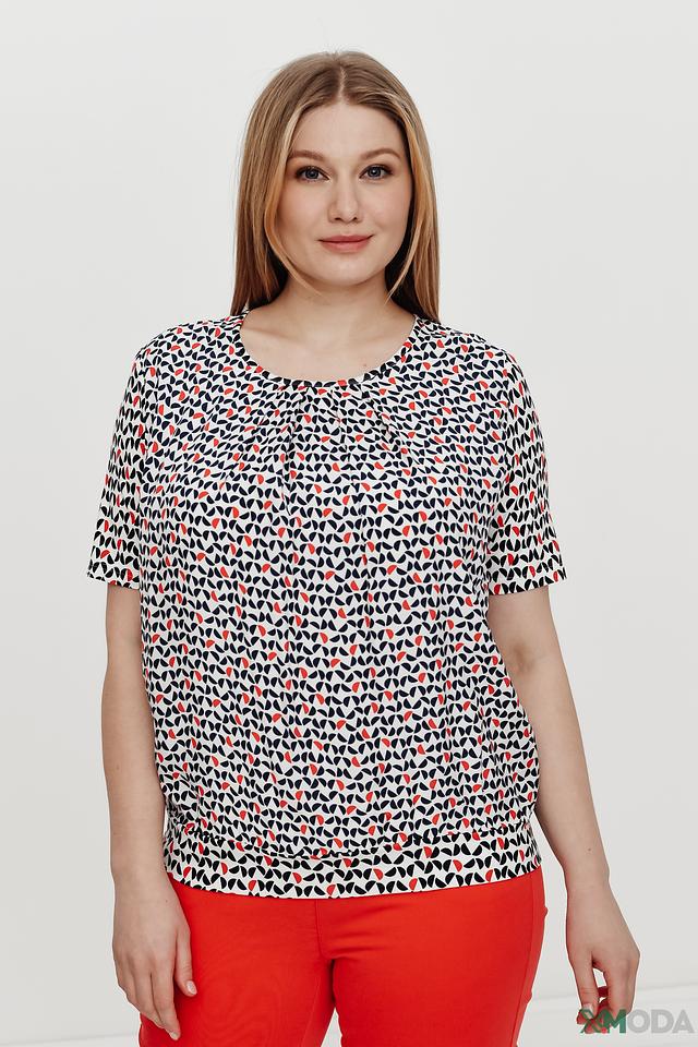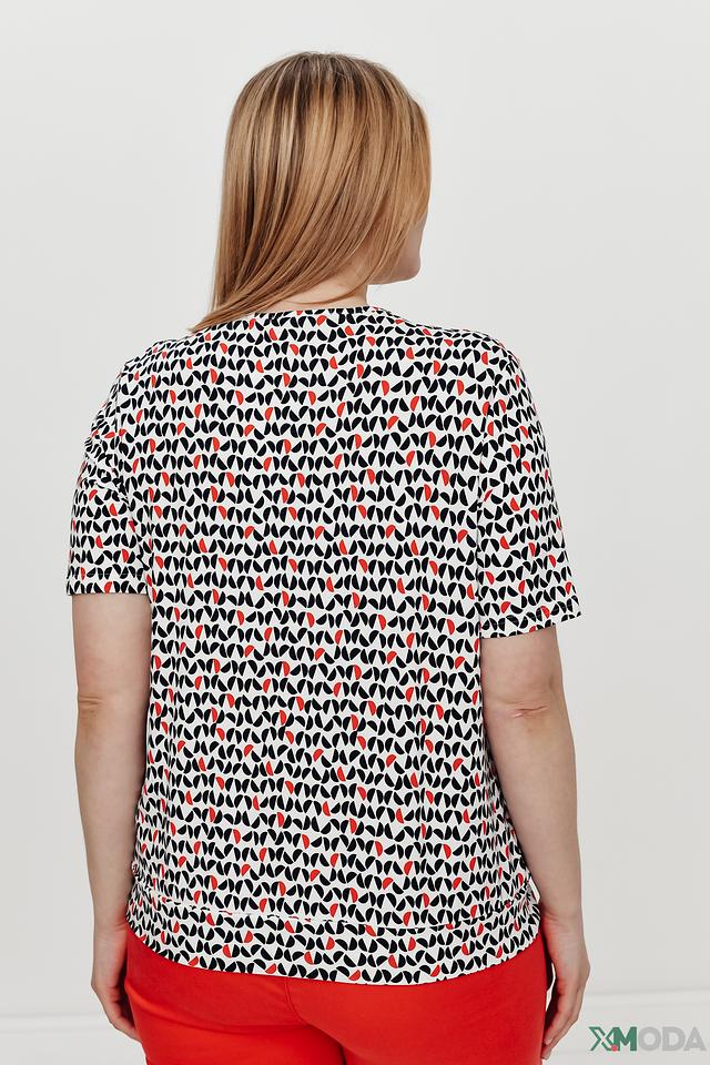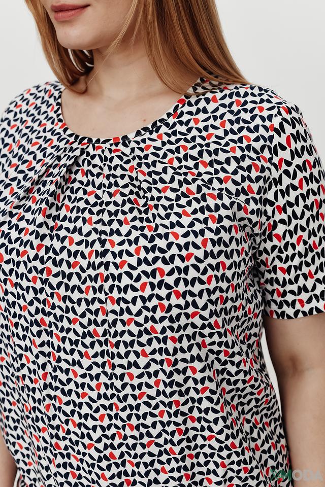 Блуза имеет свободный крой, короткие рукава и округлый вырез горловины. Главная особенность модели – оригинальный принт, выполненный в сочетании красного, чёрного и белого цветов. Геометрический узор добавляет блузе динамичности и современности.