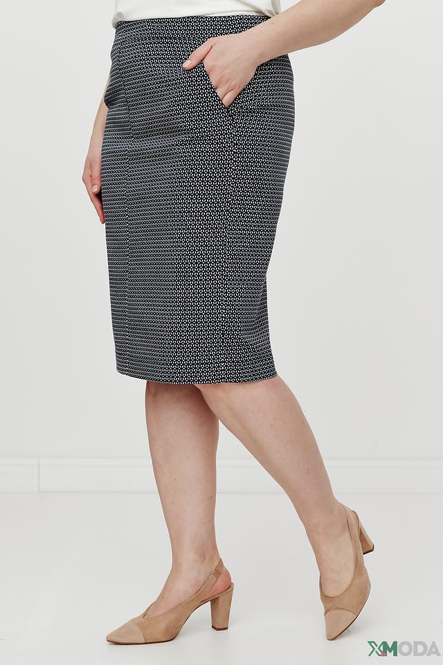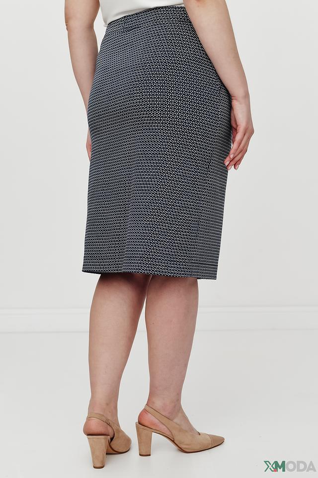 Юбка имеет классический прямой крой и длину до колена, что делает ее универсальной и подходящей для различных случаев. Темно-синий цвет с мелким геометрическим рисунком придает юбке элегантность и сдержанность.