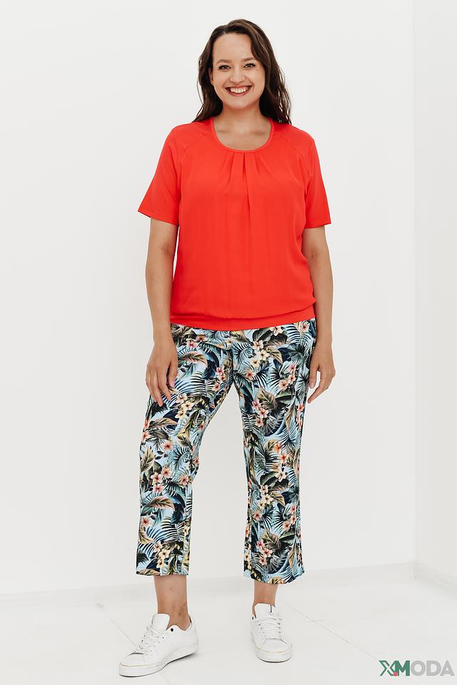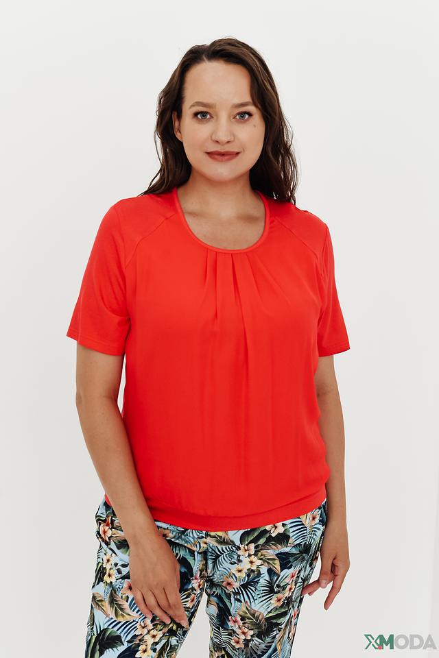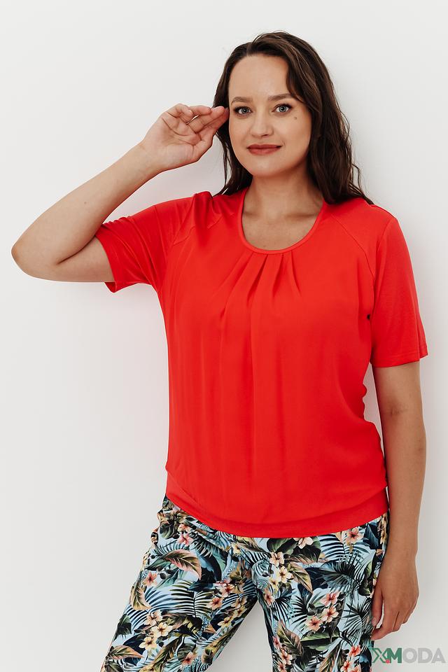 Особенностью данной модели является драпировка в области горловины, которая придает блузе элегантный и женственный вид. Короткие рукава и округлый вырез делают ее идеальной для теплой погоды. Блуза отлично сочетается с брюками, юбками и джинсами, позволяя создавать разнообразные образы.