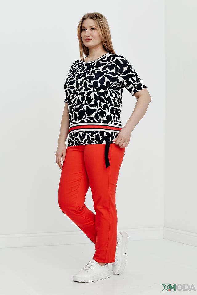 Блуза имеет оригинальный принт в виде абстрактных цветов чёрного цвета на белом фоне. Нижняя часть блузы украшена широкой красной полосой, которая добавляет образу яркости и динамики.