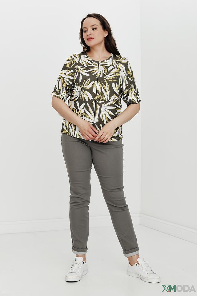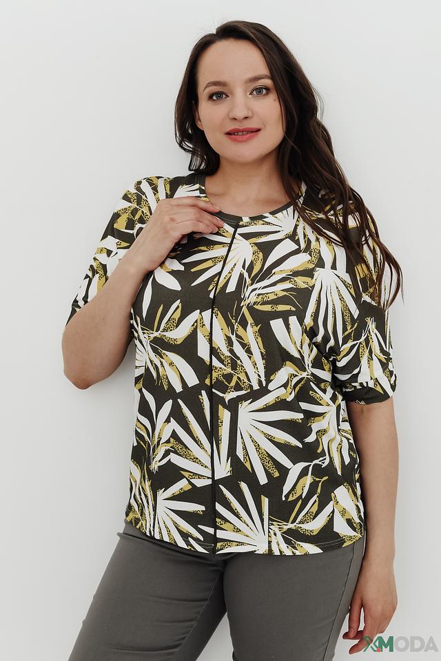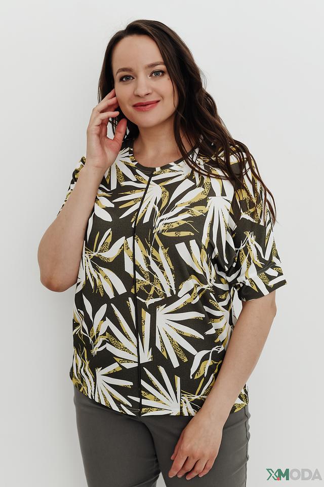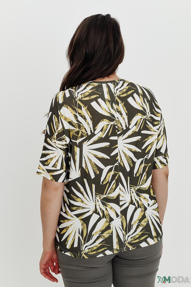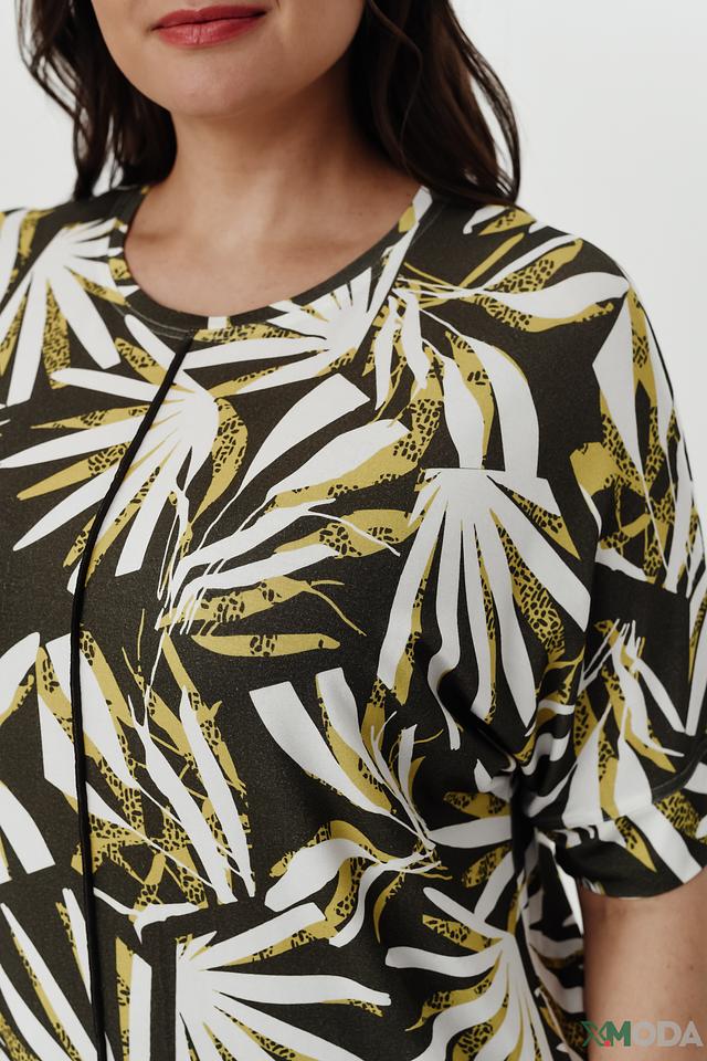 Блуза имеет прямой крой, короткие рукава и круглый вырез горловины. Главная особенность модели – эффектный принт с крупными листьями в оливковых, белых и золотистых тонах.