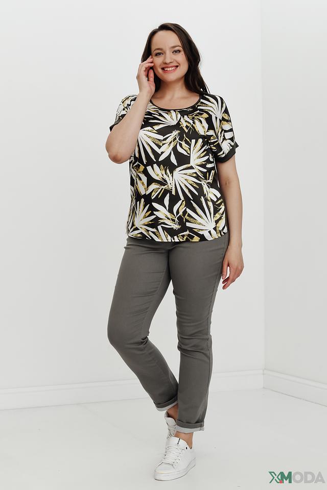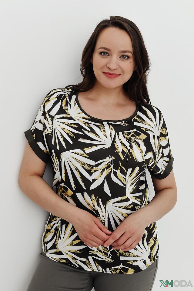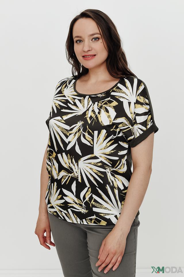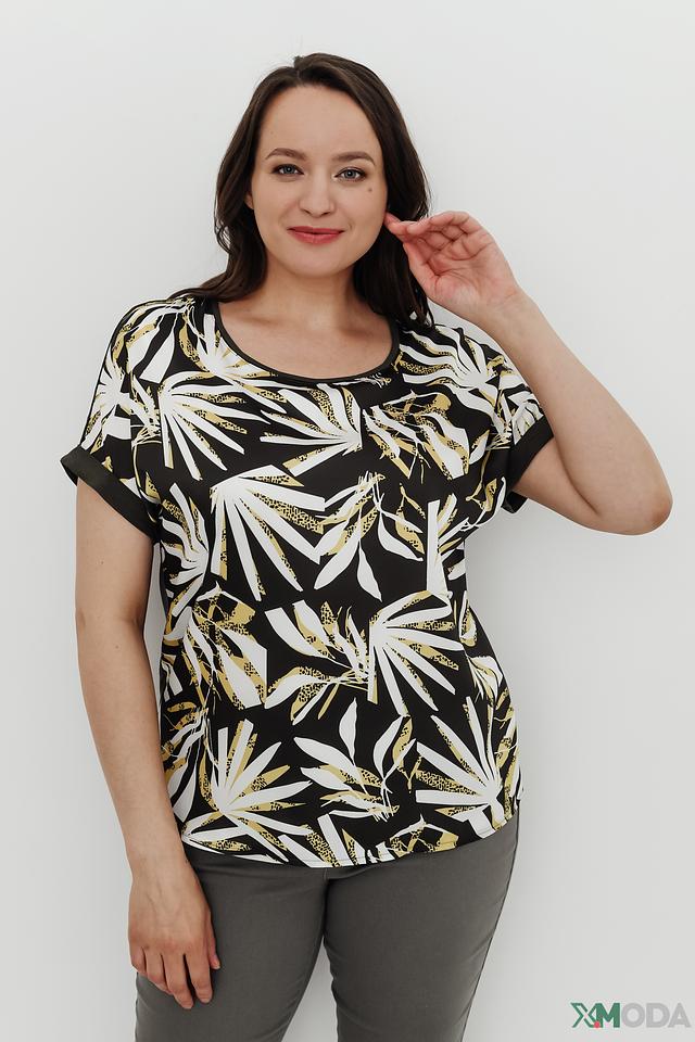 Блуза имеет свободный крой, короткие рукава с манжетами и округлый вырез горловины. Главная особенность модели – эффектный принт с изображением листьев пальм в золотистых и белых тонах на чёрном фоне.