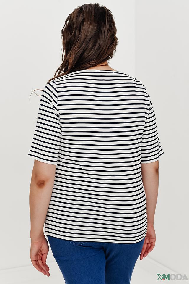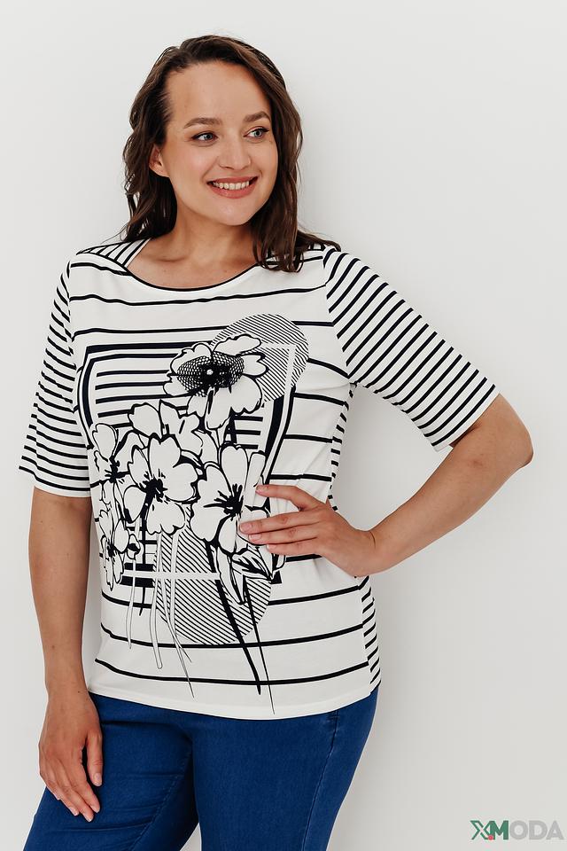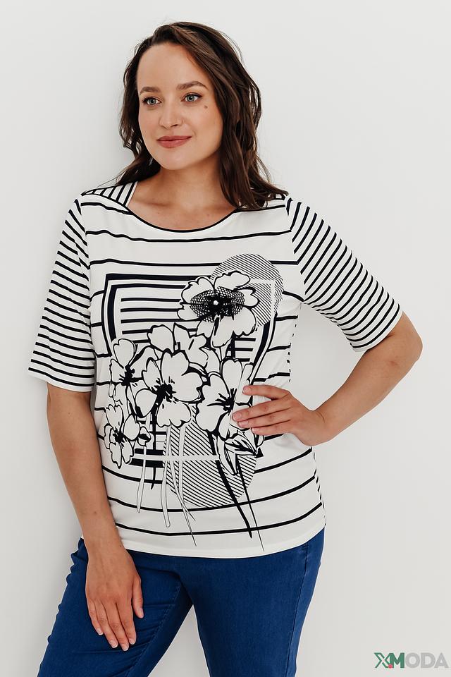 Модель имеет свободный крой, который обеспечивает комфорт в носке. Короткие рукава делают блузу идеальной для теплой погоды. Вырез горловины – округлый.