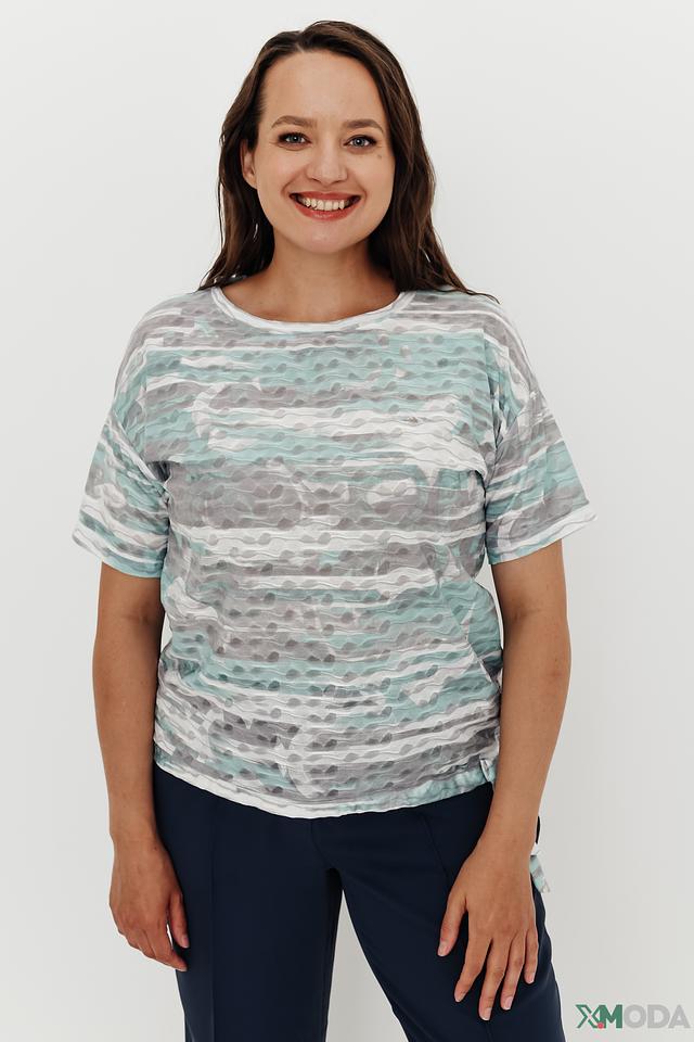 Футболка имеет свободный крой и короткие рукава, что делает её идеальной для тёплой погоды. Оригинальный принт в светло-зелёных, серых и белых тонах придаёт ей особый шарм и индивидуальность.