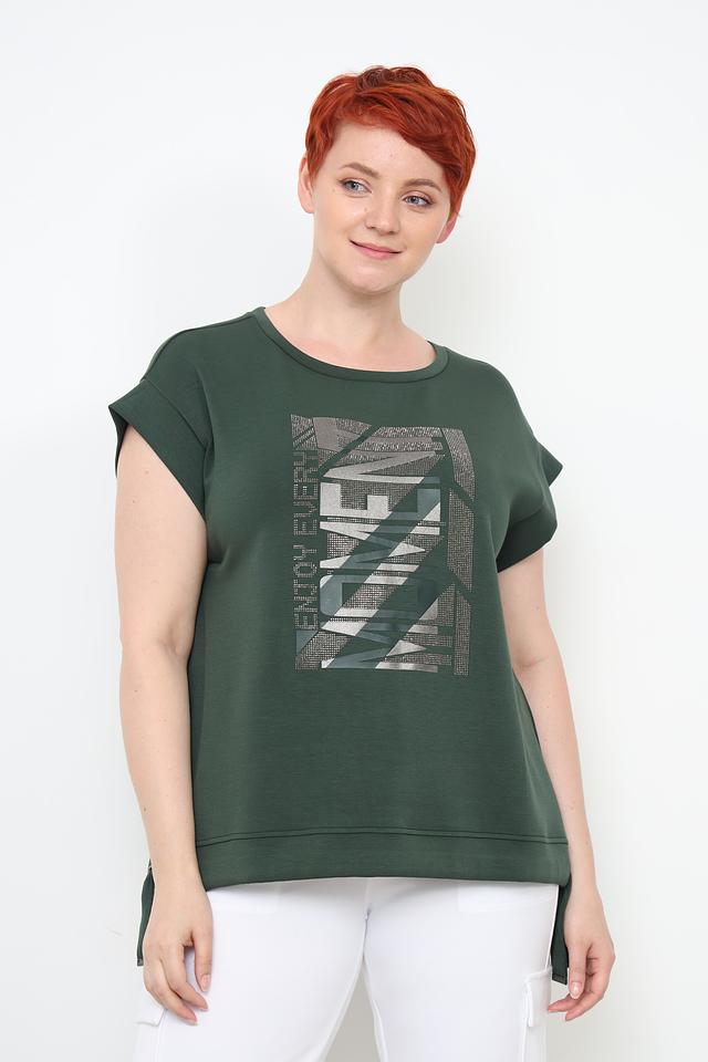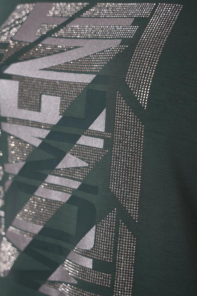 Передняя часть футболки украшена эффектным принтом с использованием серебристых элементов, добавляющим образу изысканности. Боковые разрезы внизу изделия придают ему современный и динамичный вид.