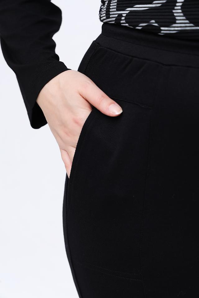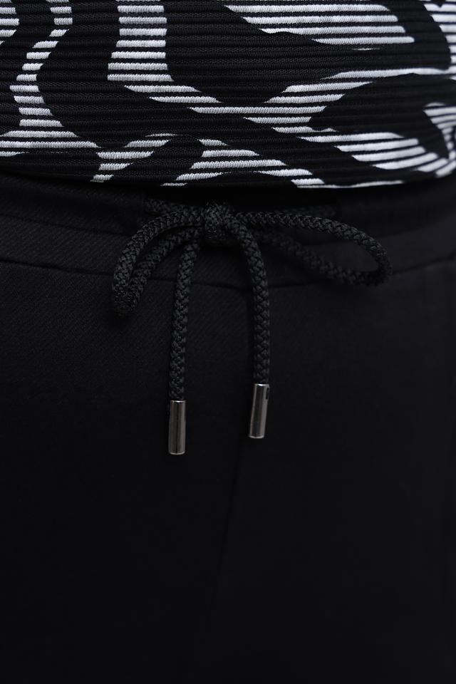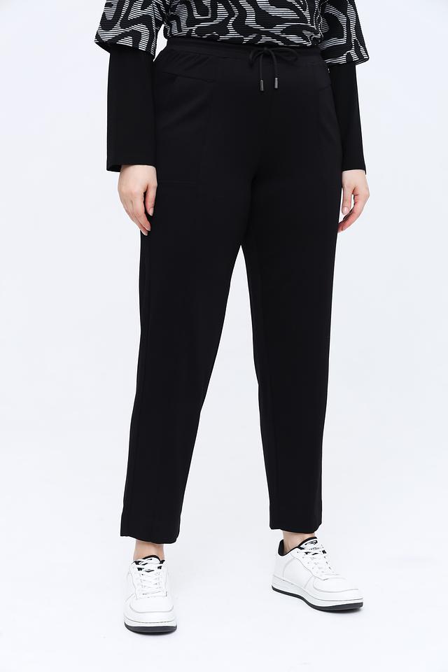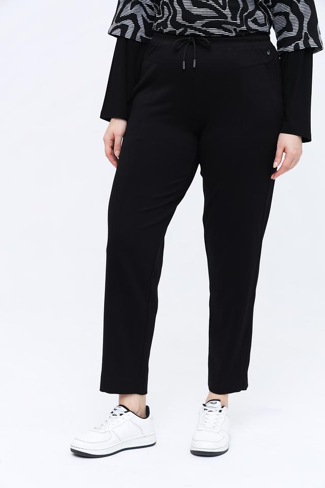 Брюки выполнены из мягкой и приятной к телу ткани, состоящей из вискозы, полиамида и эластана. Эластан в составе обеспечивает комфортную посадку и свободу движений. Удобный эластичный пояс с кулиской позволяет регулировать посадку по фигуре.