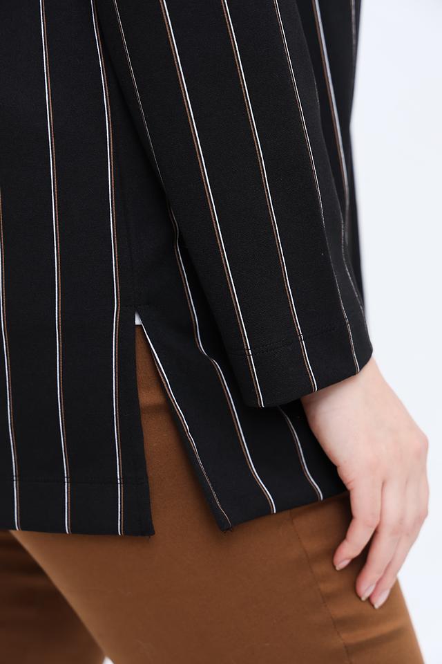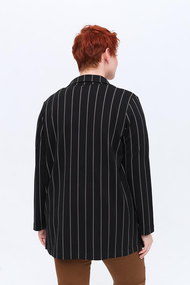 Этот жакет от Frapp станет отличным дополнением к вашему гардеробу. Он выполнен в классическом чёрном цвете с вертикальной белой полоской, что визуально вытягивает силуэт.