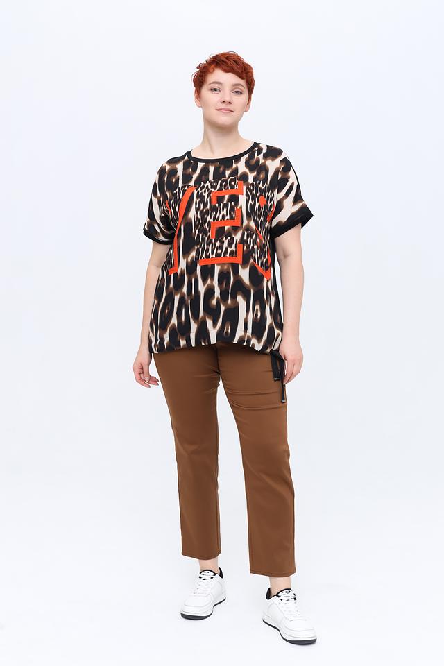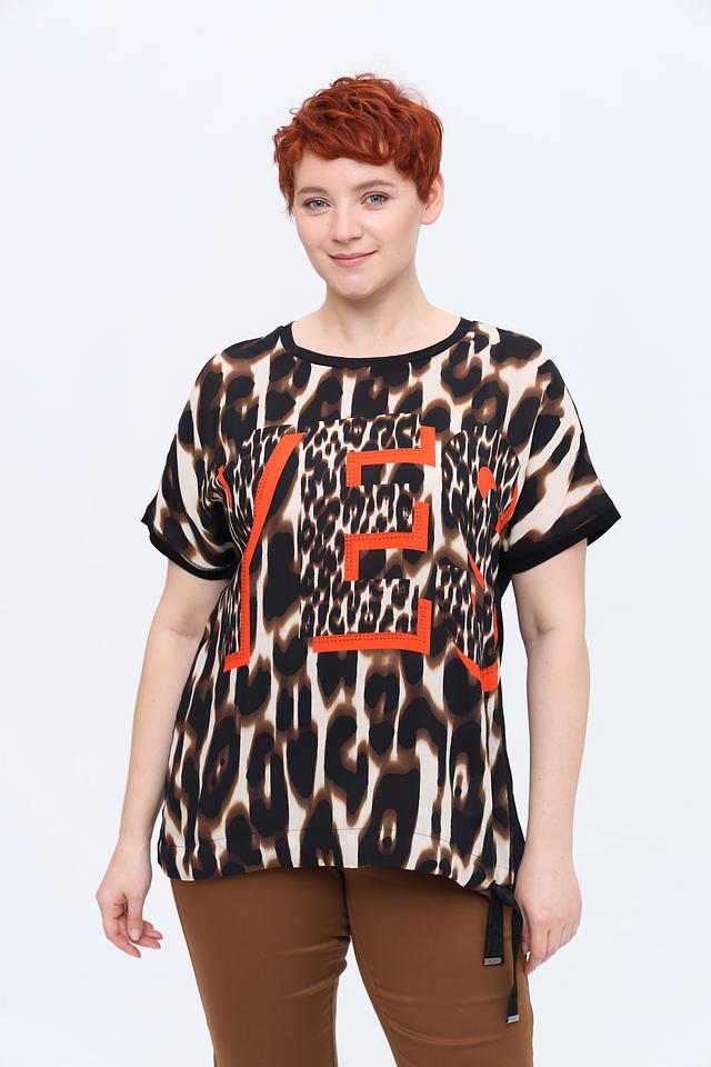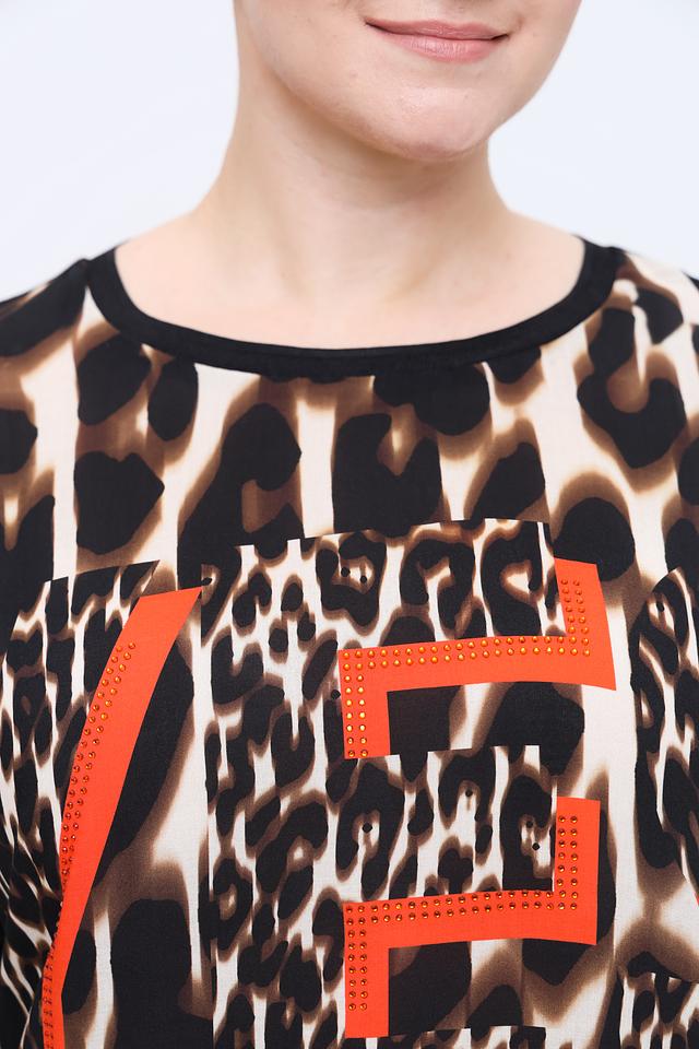 Основной принт блузы – леопардовый, выполненный в коричнево-бежевой гамме. На передней части изделия расположена яркая оранжевая вставка с графичным дизайном, которая добавляет блузе оригинальности и динамики.