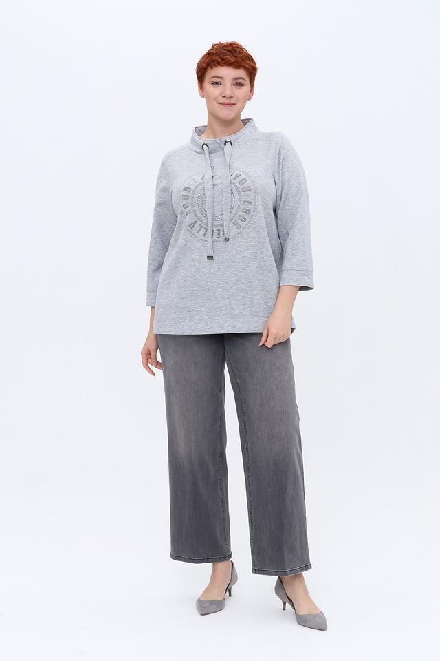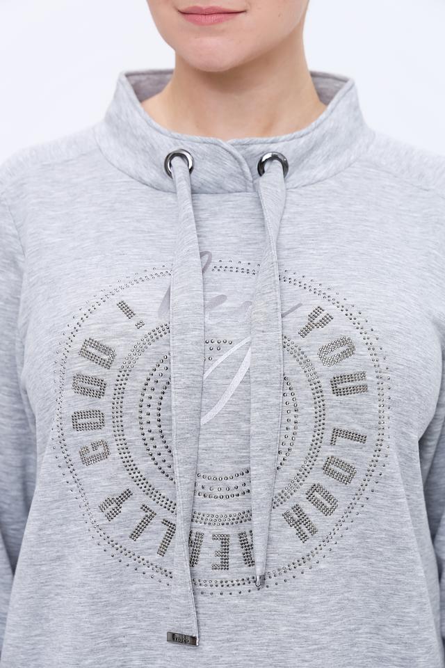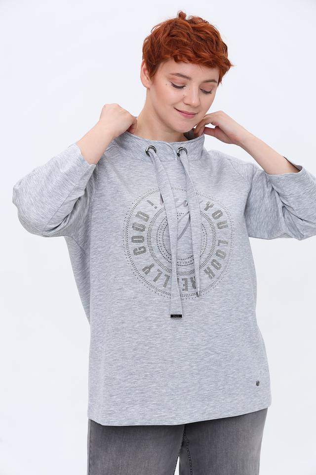 Модель украшена круглым принтом, инкрустированным стразами, что придает ей изысканность и оригинальность. Пуловер имеет капюшон со шнурками, а рукава – три четверти.