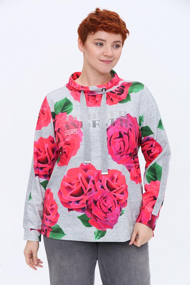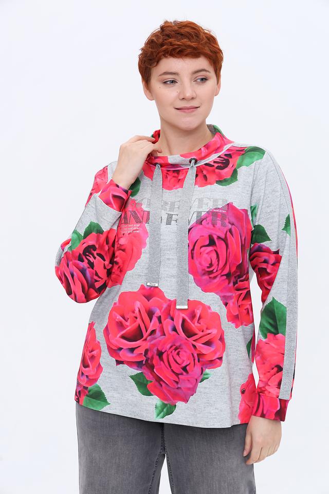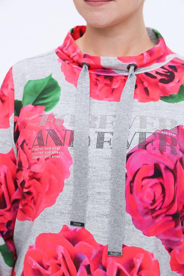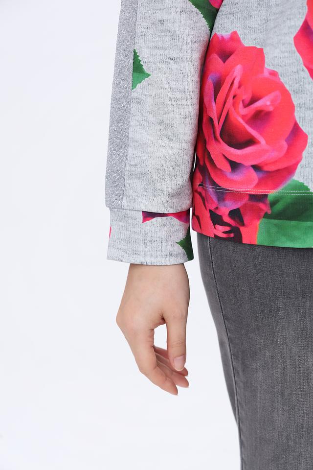 Основной цвет пуловера – серый меланж, который служит отличным фоном для крупного, реалистичного принта из ярко-розовых роз с зелеными листьями. Принт покрывает всю переднюю часть изделия и частично переходит на рукава.