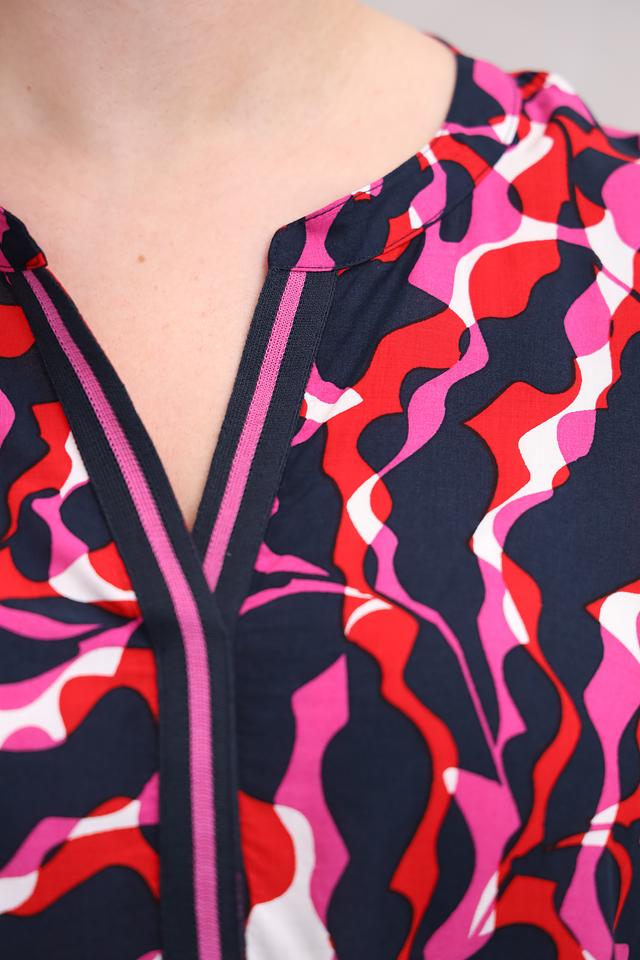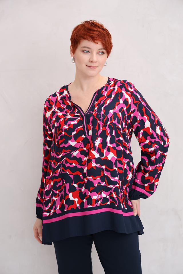 Особенности модели: свободный крой, V-образный вырез, короткий воротник-стойка, яркий принт, 100% вискоза.