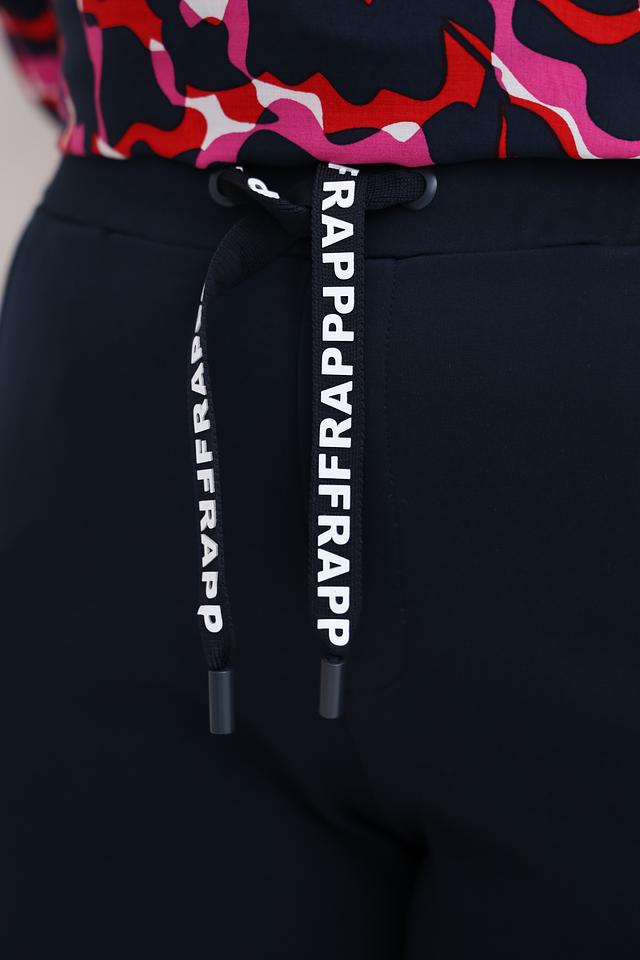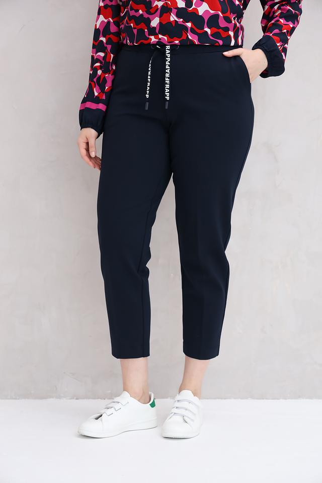Женские брюки Frapp темно-синего цвета с удобной посадкой и декоративной лентой на поясе. Модель выполнена из мягкой и приятной к телу ткани, обеспечивающей комфорт в течение дня. Состав: вискоза 69%, полиамид 26%, эластан 5%
