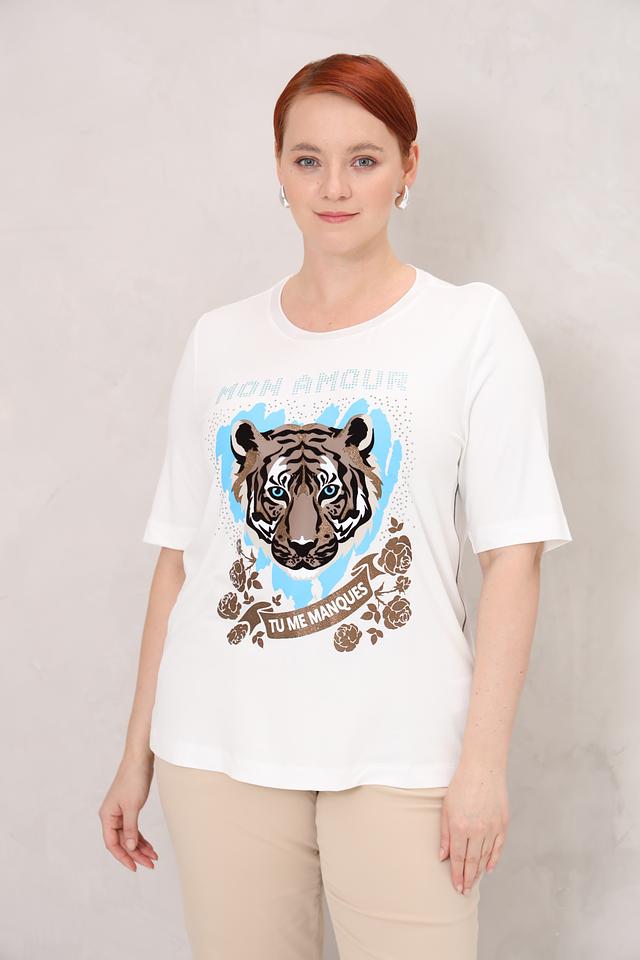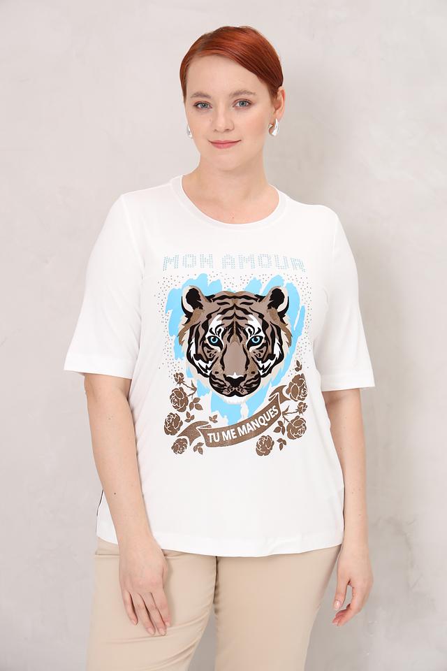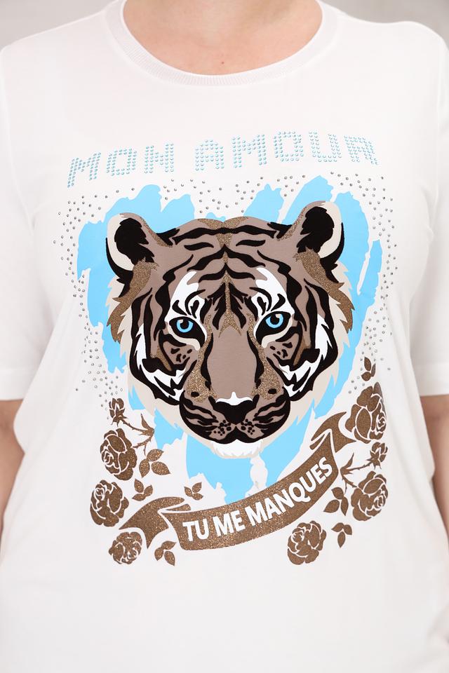Белая футболка Frapp с ярким принтом тигра и надписью "Mon Amour". Модель выполнена из мягкой вискозы с добавлением эластана для комфортной посадки и свободы движений. Состав: вискоза 90%, эластан 10%