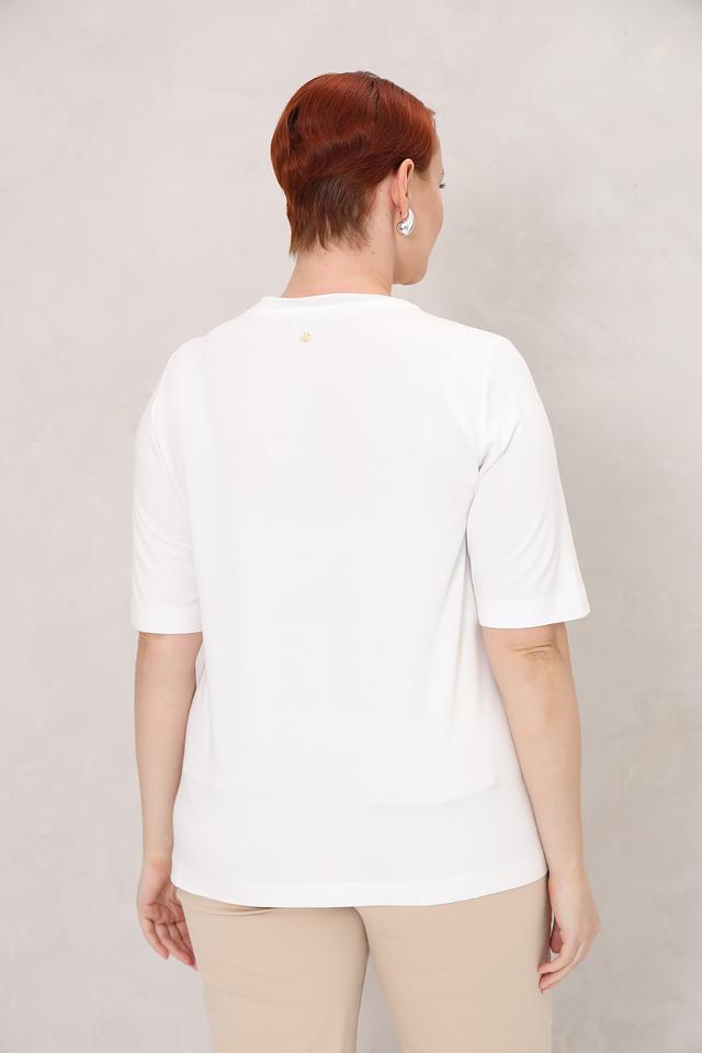 Состав ткани – 90% вискоза и 10% эластан, благодаря чему футболка приятна к телу, хорошо драпируется и не мнется. Она идеально подойдет для создания повседневных образов, сочетаясь с джинсами, шортами или юбками.