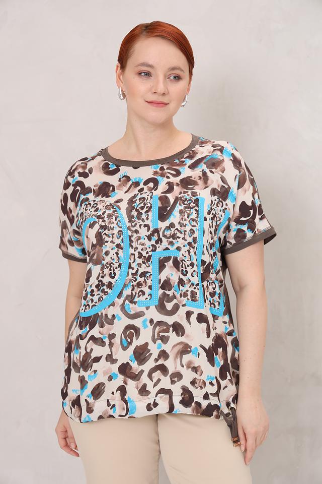 Женская футболка Frapp бежевого цвета с ярким леопардовым принтом и оригинальным дизайном. Модель свободного кроя выполнена из мягкой вискозы с добавлением эластана для комфорта и удобства. Состав: вискоза 90%, эластан 10%